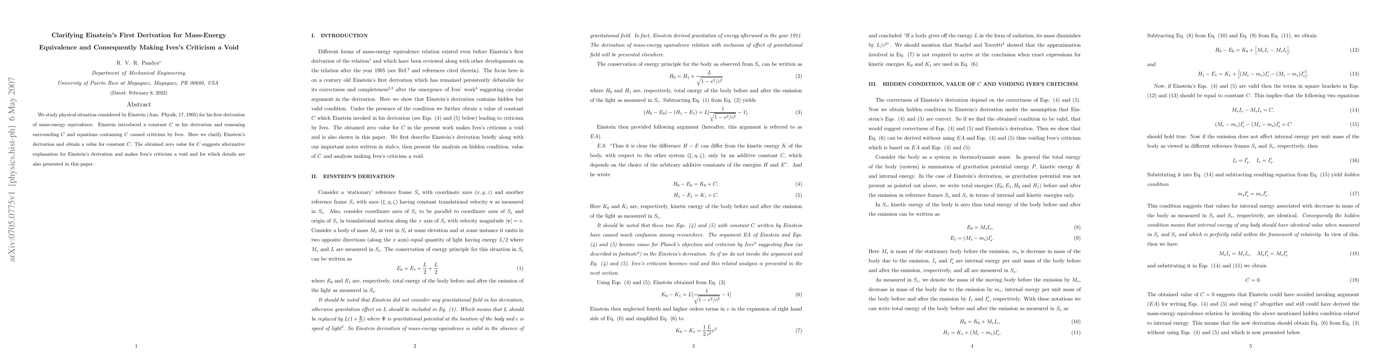 We study physical situation considered by Einstein (Ann. Physik, 17, 1905) for his first derivation of mass-energy equivalence. Einstein introduced a constant $C$ in his derivation and reasoning surrounding $C$ and equations containing $C$ caused criticism by Ives. Here we clarify Einstein's derivation and obtain a value for constant $C$. The obtained zero value for $C$ suggests alternative explanation for Einstein's derivation and makes Ives's criticism a void and for which details are also presented in this paper.