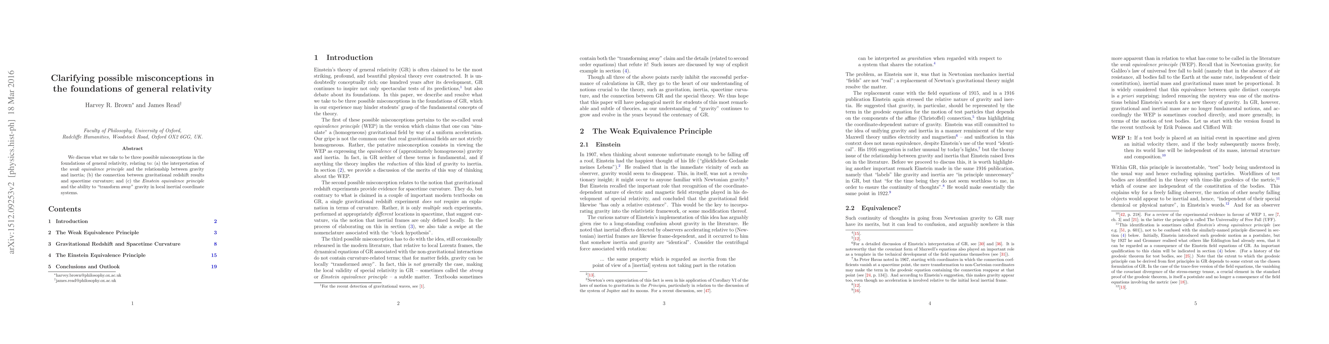 We discuss what we take to be three possible misconceptions in the foundations of general relativity, relating to: (a) the interpretation of the weak equivalence principle and the relationship between gravity and inertia; (b) the connection between gravitational redshift results and spacetime curvature; and (c) the Einstein equivalence principle and the ability to "transform away" gravity in local inertial coordinate systems.