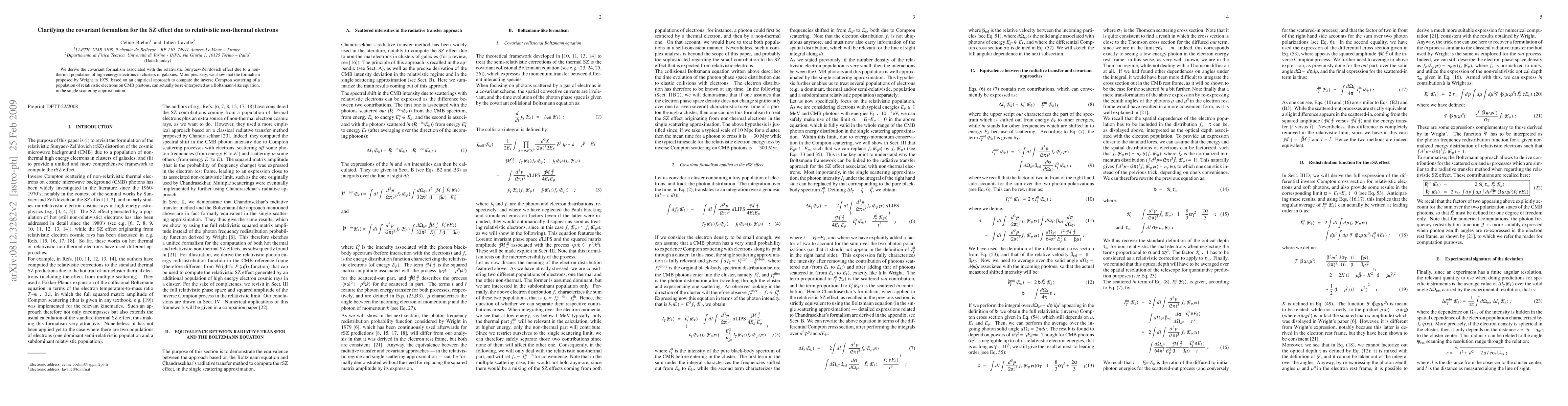 This paper clarifies the covariant formalism for the Sunyaev-Zel'dovich effect caused by high-energy, non-thermal electrons in galaxy clusters. It shows that Wright's 1979 empirical approach, commonly used to calculate inverse Compton scattering of relativistic electrons on CMB photons, can be reinterpreted as a Boltzmann-like equation under the single scattering approximation.