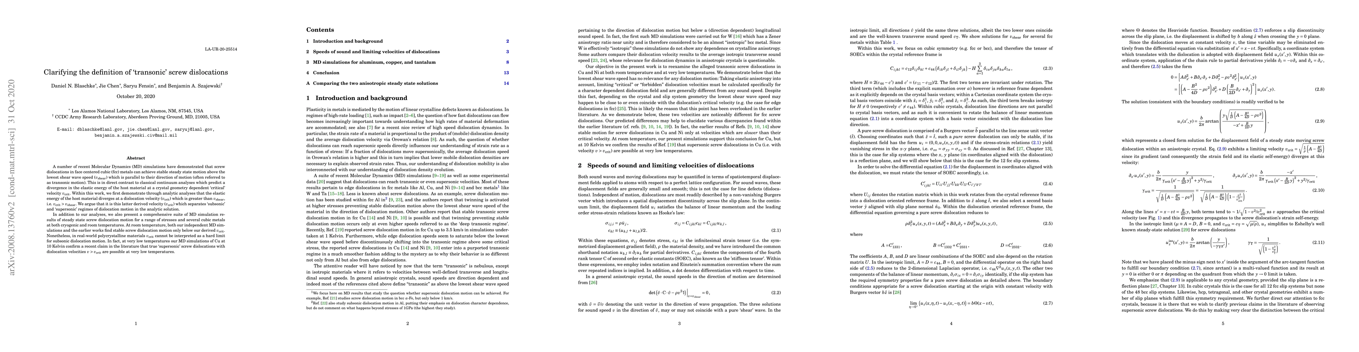 The research utilized analytic analyses within the theory of linear elasticity and Molecular Dynamics (MD) simulations to study screw dislocation motion in face-centered cubic (fcc) metals, clarifying the concept of 'transonic' motion.