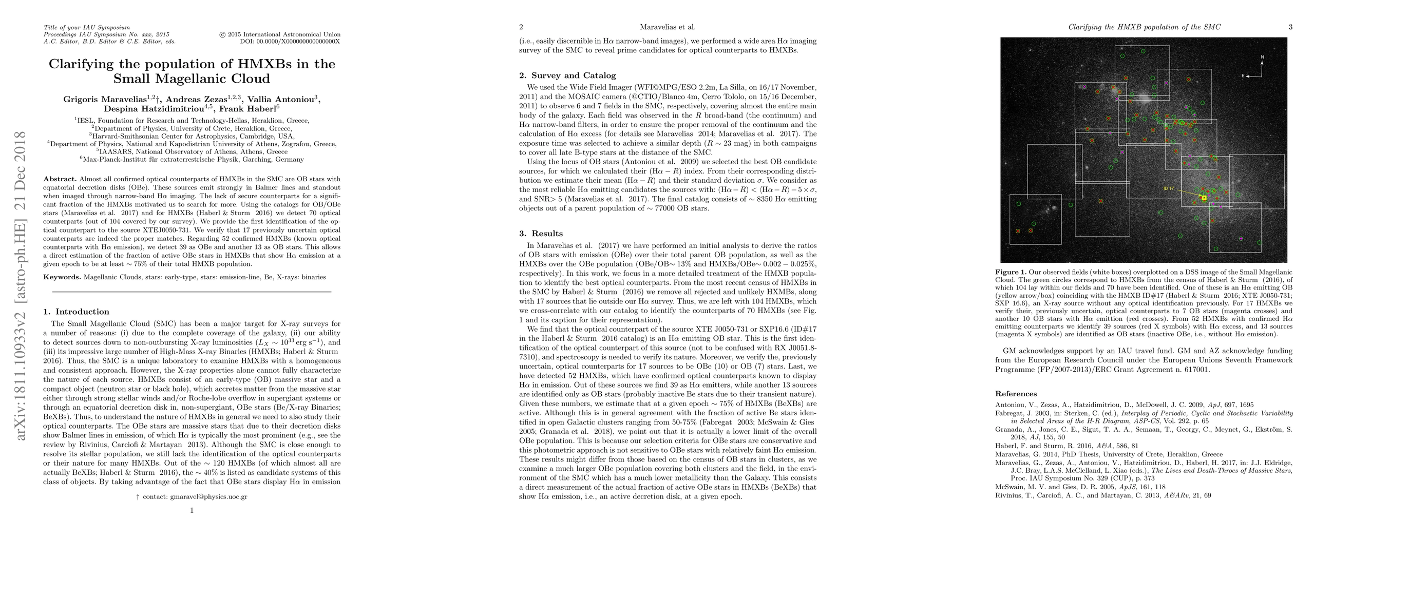 Almost all confirmed optical counterparts of HMXBs in the SMC are OB stars with equatorial decretion disks (OBe). These sources emit strongly in Balmer lines and standout when imaged through narrow-band H{\alpha} imaging. The lack of secure counterparts for a significant fraction of the HMXBs motivated us to search for more. Using the catalogs for OB/OBe stars (Maravelias et al. 2017) and for HMXBs (Haberl & Sturm 2016) we detect 70 optical counterparts (out of 104 covered by our survey). We provide the first identification of the optical counterpart to the source XTEJ0050-731. We verify that 17 previously uncertain optical counterparts are indeed the proper matches. Regarding 52 confirmed HMXBs (known optical counterparts with H{\alpha} emission), we detect 39 as OBe and another 13 as OB stars. This allows a direct estimation of the fraction of active OBe stars in HMXBs that show H{\alpha} emission at a given epoch to be at least $\sim75\%$ of their total HMXB population.