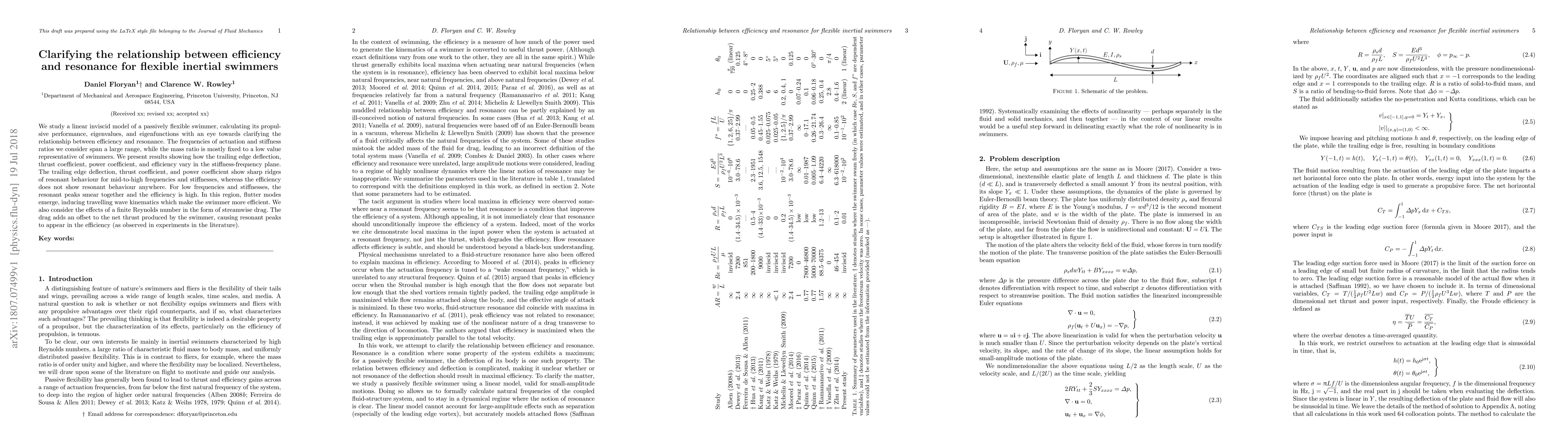 We study a linear inviscid model of a passively flexible swimmer, calculating its propulsive performance, eigenvalues, and eigenfunctions with an eye towards clarifying the relationship between efficiency and resonance. The frequencies of actuation and stiffness ratios we consider span a large range, while the mass ratio is mostly fixed to a low value representative of swimmers. We present results showing how the trailing edge deflection, thrust coefficient, power coefficient, and efficiency vary in the stiffness-frequency plane. The trailing edge deflection, thrust coefficient, and power coefficient show sharp ridges of resonant behaviour for mid-to-high frequencies and stiffnesses, whereas the efficiency does not show resonant behaviour anywhere. For low frequencies and stiffnesses, the resonant peaks smear together and the efficiency is high. In this region, flutter modes emerge, inducing travelling wave kinematics which make the swimmer more efficient. We also consider the effects of a finite Reynolds number in the form of streamwise drag. The drag adds an offset to the net thrust produced by the swimmer, causing resonant peaks to appear in the efficiency (as observed in experiments in the literature).