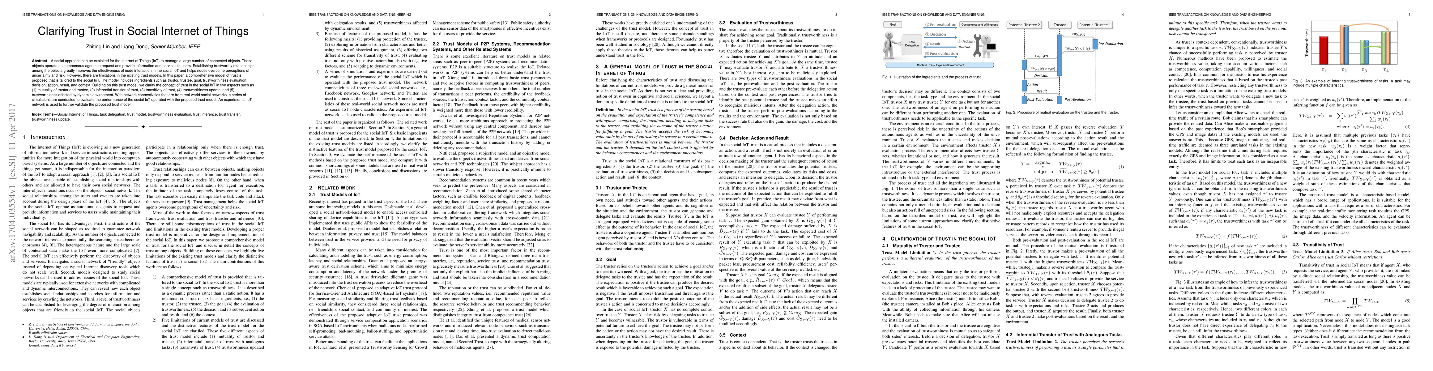 This paper proposes a comprehensive trust model tailored for the social Internet of Things (IoT), addressing limitations in existing models. It clarifies trust through five aspects and validates the model with simulations and an experimental IoT network, demonstrating improved node interaction effectiveness.