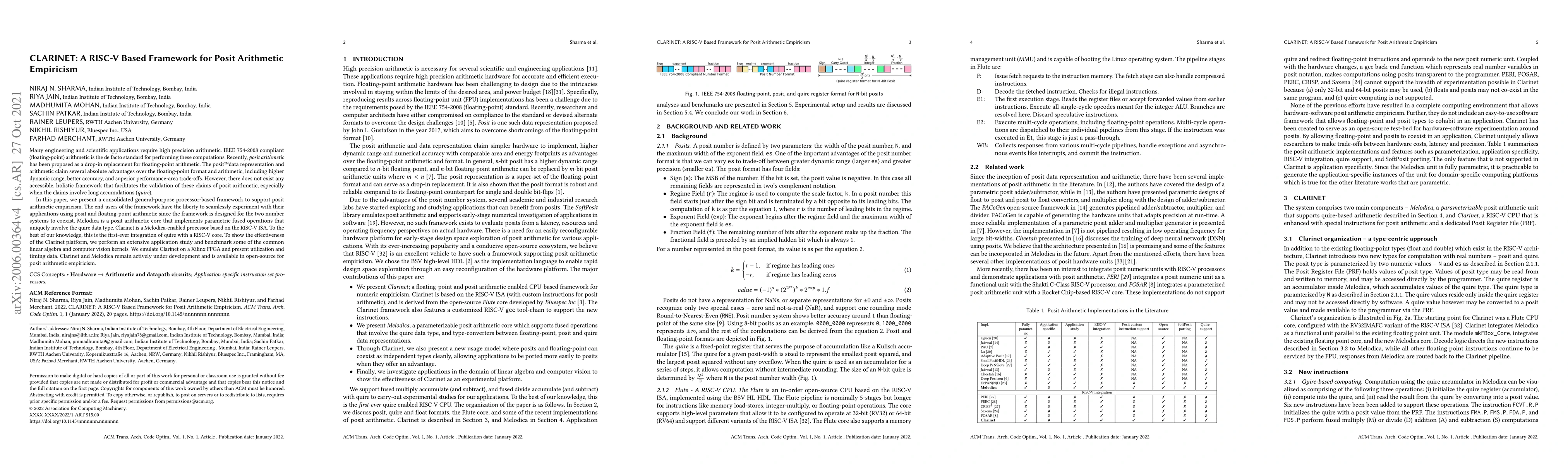 Many engineering and scientific applications require high precision arithmetic. IEEE~754-2008 compliant (floating-point) arithmetic is the de facto standard for performing these computations. Recently, posit arithmetic has been proposed as a drop-in replacement for floating-point arithmetic. The posit\texttrademark data representation and arithmetic claim several absolute advantages over the floating-point format and arithmetic, including higher dynamic range, better accuracy, and superior performance-area trade-offs. However, there does not exist any accessible, holistic framework that facilitates the validation of these claims of posit arithmetic, especially when the claims involve long accumulations (quire). In this paper, we present a consolidated general-purpose processor-based framework to support posit arithmetic empiricism. The end-users of the framework have the liberty to seamlessly experiment with their applications using posit and floating-point arithmetic since the framework is designed for the two number systems to coexist. Melodica is a posit arithmetic core that implements parametric fused operations that uniquely involve the quire data type. Clarinet is a Melodica-enabled processor based on the RISC-V ISA. To the best of our knowledge, this is the first-ever integration of quire with a RISC-V core. To show the effectiveness of the Clarinet platform, we perform an extensive application study and benchmark some of the common linear algebra and computer vision kernels. We emulate Clarinet on a Xilinx FPGA and present utilization and timing data. Clarinet and Melodica remain actively under development and is available in open-source for posit arithmetic empiricism.