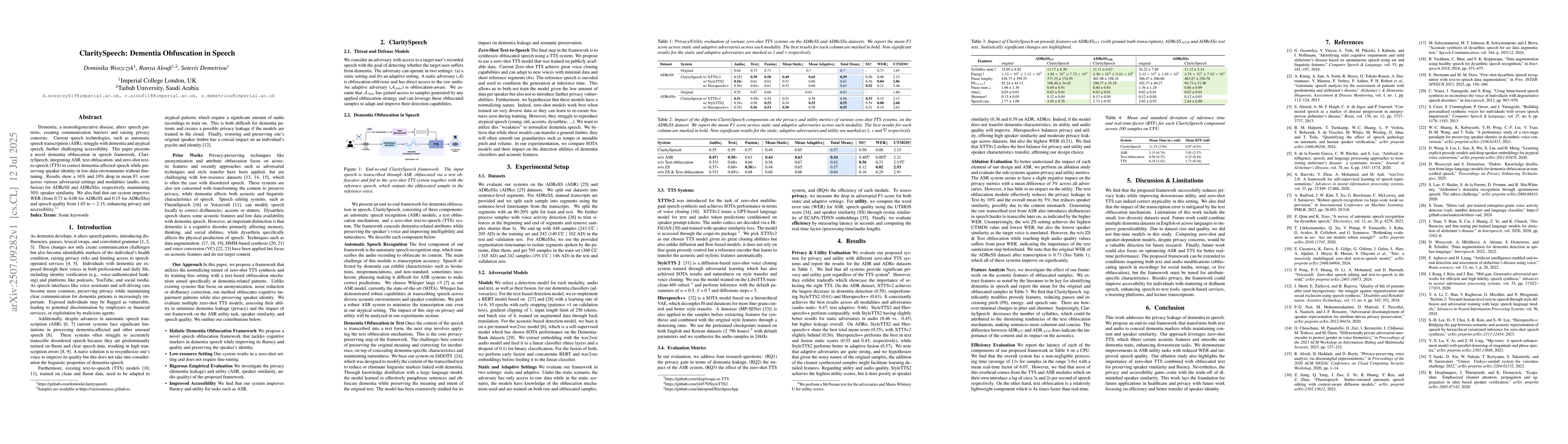 Dementia, a neurodegenerative disease, alters speech patterns, creating communication barriers and raising privacy concerns. Current speech technologies, such as automatic speech transcription (ASR), struggle with dementia and atypical speech, further challenging accessibility. This paper presents a novel dementia obfuscation in speech framework, ClaritySpeech, integrating ASR, text obfuscation, and zero-shot text-to-speech (TTS) to correct dementia-affected speech while preserving speaker identity in low-data environments without fine-tuning. Results show a 16% and 10% drop in mean F1 score across various adversarial settings and modalities (audio, text, fusion) for ADReSS and ADReSSo, respectively, maintaining 50% speaker similarity. We also find that our system improves WER (from 0.73 to 0.08 for ADReSS and 0.15 for ADReSSo) and speech quality from 1.65 to ~2.15, enhancing privacy and accessibility.
