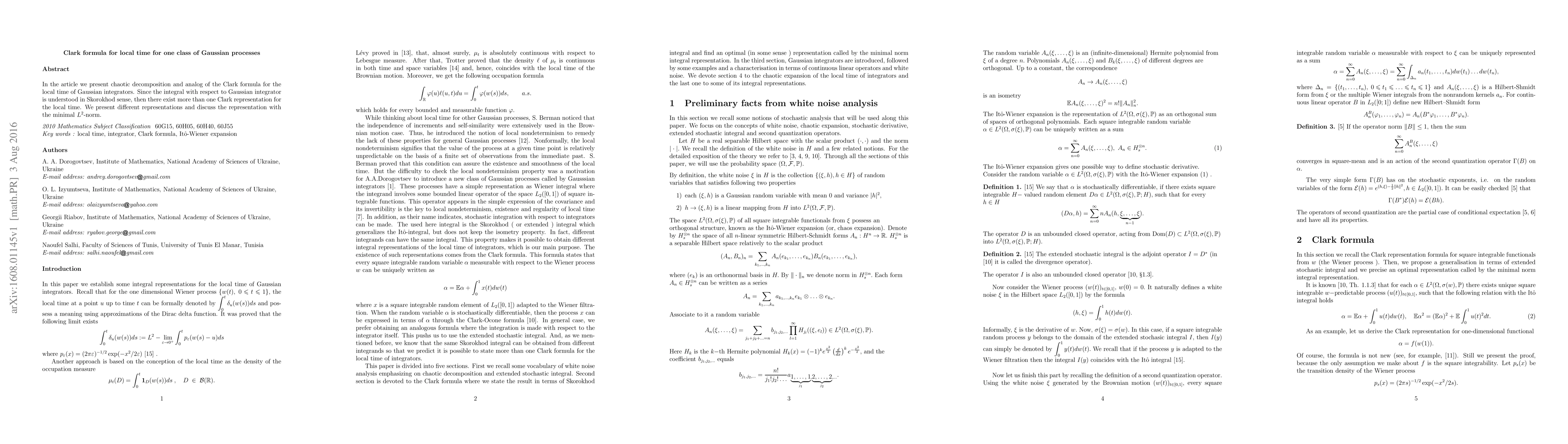 This paper presents chaotic decomposition and various Clark representations for the local time of Gaussian integrators, focusing on the representation with the minimal L_2-norm in the Skorokhod sense.