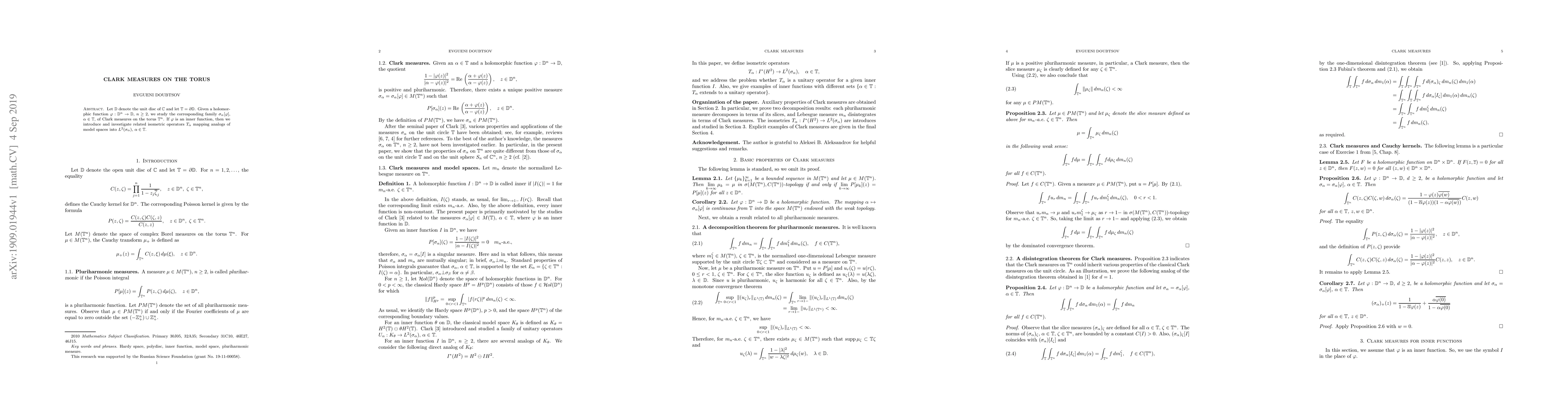 This paper studies Clark measures on the torus $\mathbb{T}^n$ derived from holomorphic functions $\varphi: \mathbb{D}^n \to \mathbb{D}$, focusing on inner functions and introducing isometric operators $T_\alpha$ that map model space analogs into $L^2(\sigma_\alpha)$.