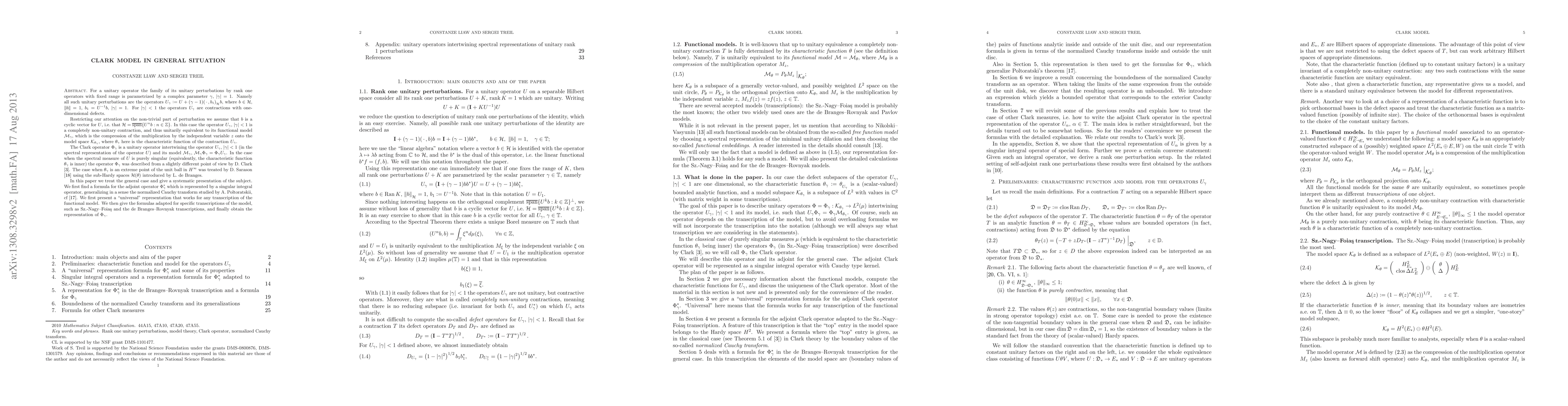 For a unitary operator the family of its unitary perturbations by rank one operators with fixed range is parametrized by a complex parameter $\gamma, |\gamma|=1$. Namely all such unitary perturbations are $U_\gamma:=U+(\gamma-1) (., b_1)_{\mathcal H} b$, where $b\in\mathcal H, \|b\|=1, b_1=U^{-1} b, |\gamma|=1$. For $|\gamma|<1$ operators $U_\gamma$ are contractions with one-dimensional defects. Restricting our attention on the non-trivial part of perturbation we assume that $b$ is cyclic for $U$. Then the operator $U_\gamma$, $|\gamma|<1$ is a completely non-unitary contraction, and thus unitarily equivalent to its functional model $\mathcal M_\gamma$, which is the compression of the multiplication by the independent variable $z$ onto the model space $\mathcal K_{\theta_\gamma}$, where $\theta_\gamma$ is the characteristic function of the contraction $U_\gamma$. The Clark operator $\Phi_\gamma$ is a unitary operator intertwining $U_\gamma, |\gamma|<1$ and its model $\mathcal M_\gamma$, $\mathcal M_\gamma \Phi_\gamma = \Phi_\gamma U_\gamma$. If spectral measure of $U$ is purely singular (equivalently, $\theta_\gamma$ is inner), operator $\Phi_\gamma$ was described from a slightly different point of view by D. Clark. When $\theta_\gamma$ is extreme point of the unit ball in $H^\infty$ was treated by D. Sarason using the sub-Hardy spaces introduced by L. de Branges. We treat the general case and give a systematic presentation of the subject. We find a formula for the adjoint operator $\Phi^*_\gamma$ which is represented by a singular integral operator, generalizing the normalized Cauchy transform studied by A. Poltoratskii. We present a "universal" representation that works for any transcription of the functional model. We then give the formulas adapted for the Sz.-Nagy--Foias and de Branges--Rovnyak transcriptions, and finally obtain the representation of $\Phi_\gamma$.