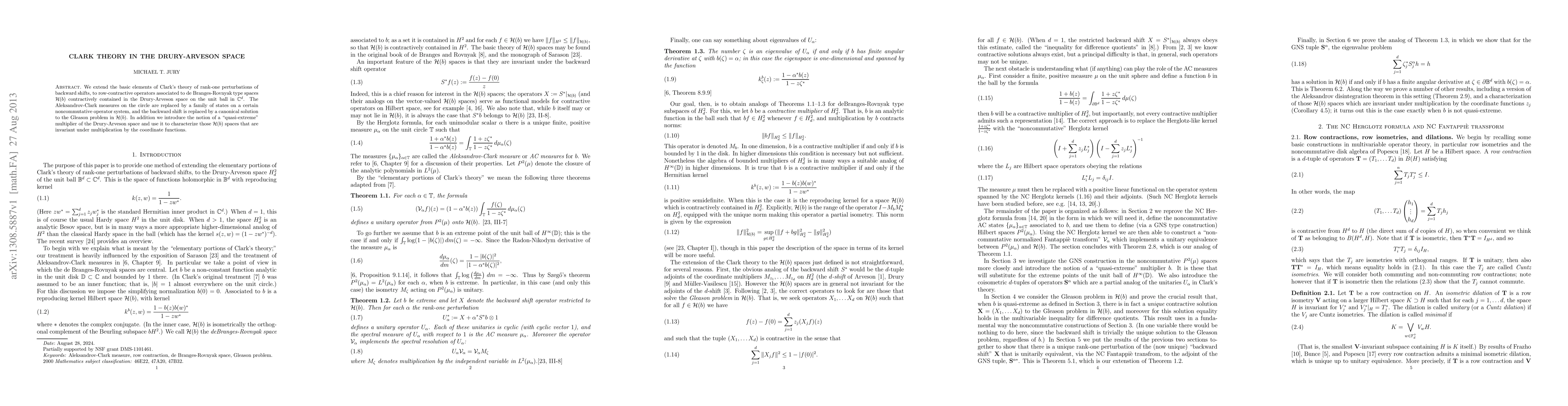 We extend the basic elements of Clark's theory of rank-one perturbations of backward shifts, to row-contractive operators associated to de Branges-Rovnyak type spaces $\mathcal H(b)$ contractively contained in the Drury-Arveson space on the unit ball in $\mathbb C^d$. The Aleksandrov-Clark measures on the circle are replaced by a family of states on a certain noncommutative operator system, and the backward shift is replaced by a canonical solution to the Gleason problem in $\mathcal H(b)$. In addition we introduce the notion of a "quasi-extreme" multiplier of the Drury-Arveson space and use it to characterize those $\mathcal H(b)$ spaces that are invariant under multiplication by the coordinate functions.