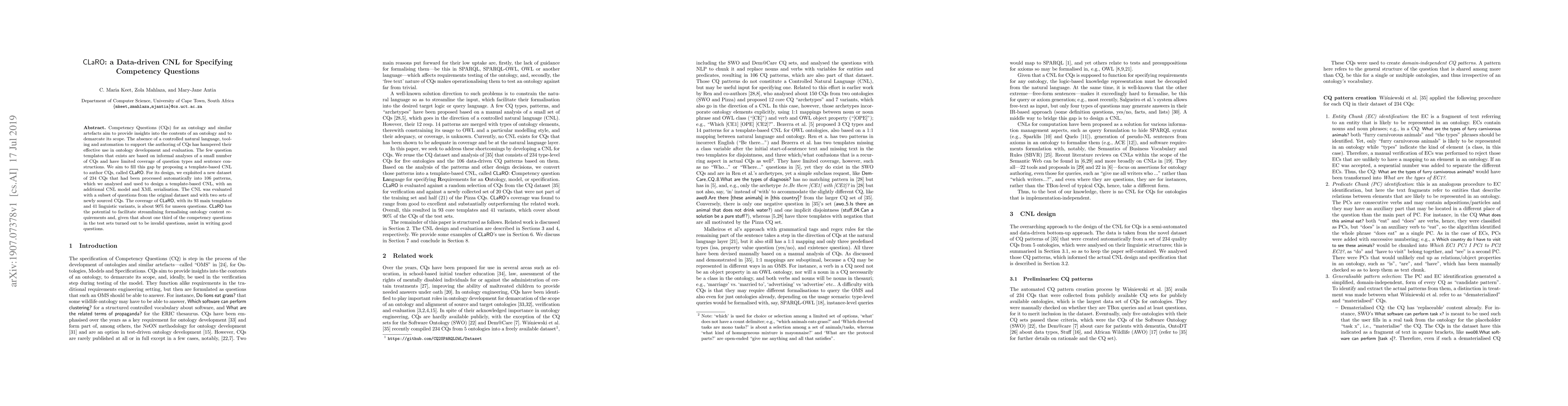 CLaRO is a template-based controlled natural language designed to facilitate the creation of Competency Questions for ontologies, leveraging a dataset of 234 processed questions to define 93 main templates and 41 variants, achieving 90% coverage for unseen questions. It aims to streamline ontology development and improve the quality of competency questions.