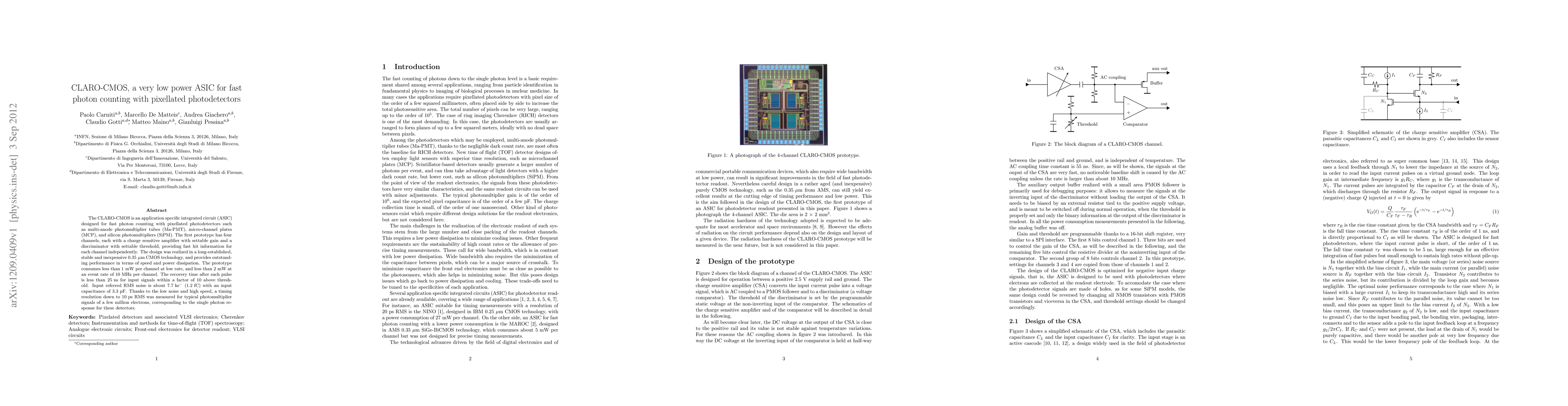 The CLARO-CMOS is an application specific integrated circuit (ASIC) designed for fast photon counting with pixellated photodetectors such as multi-anode photomultiplier tubes (Ma-PMT), micro-channel plates (MCP), and silicon photomultipliers (SiPM). The first prototype has four channels, each with a charge sensitive amplifier with settable gain and a discriminator with settable threshold, providing fast hit information for each channel independently. The design was realized in a long-established, stable and inexpensive 0.35 um CMOS technology, and provides outstanding performance in terms of speed and power dissipation. The prototype consumes less than 1 mW per channel at low rate, and less than 2 mW at an event rate of 10 MHz per channel. The recovery time after each pulse is less than 25 ns for input signals within a factor of 10 above threshold. Input referred RMS noise is about 7.7 ke^- (1.2 fC) with an input capacitance of 3.3 pF. Thanks to the low noise and high speed, a timing resolution down to 10 ps RMS was measured for typical photomultiplier signals of a few million electrons, corresponding to the single photon response for these detectors.