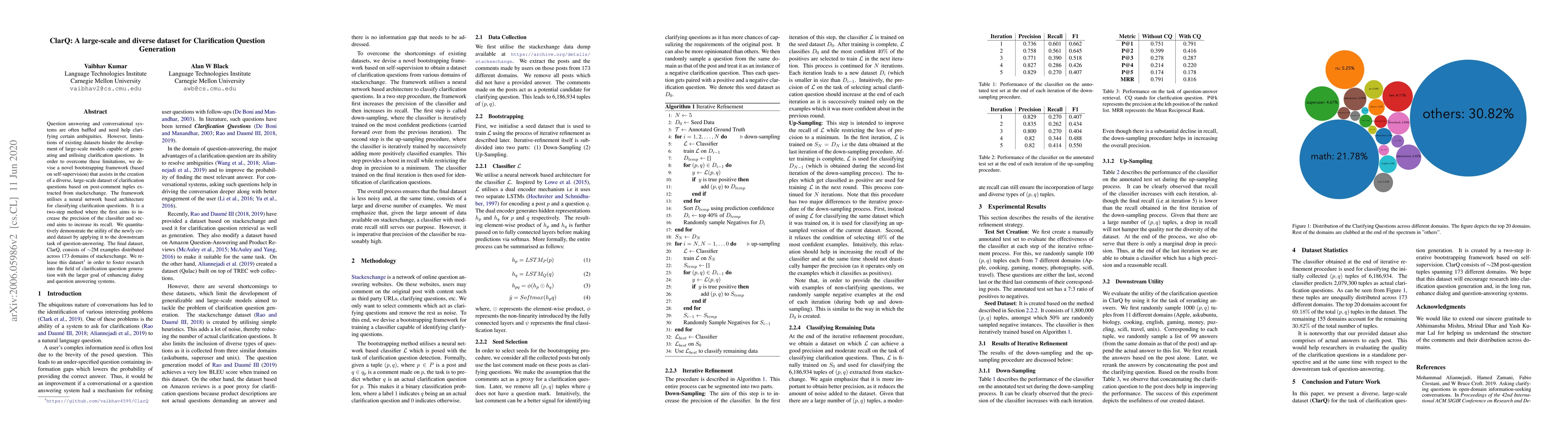 The paper introduces ClarQ, a large-scale dataset of clarification questions derived from StackExchange, aiming to enhance question answering and conversational systems. The authors employ a self-supervised bootstrapping framework to generate the dataset, which consists of ~2M examples across 173 domains, and demonstrate its utility in improving question-answering performance.