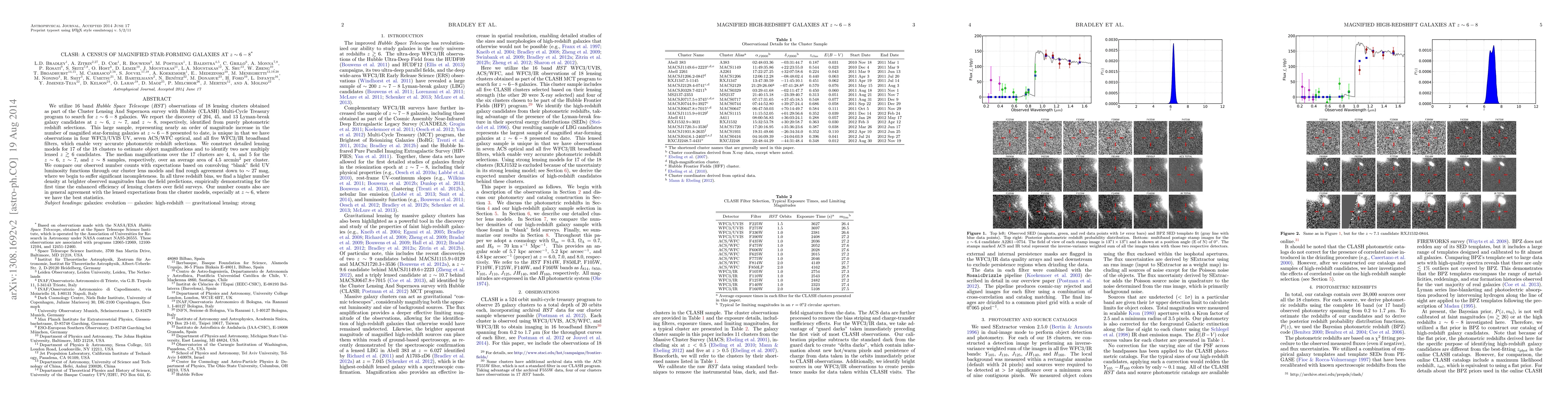 We utilize 16 band Hubble Space Telescope (HST) observations of 18 lensing clusters obtained as part of the Cluster Lensing And Supernova survey with Hubble (CLASH) Multi-Cycle Treasury program to search for $z\sim6-8$ galaxies. We report the discovery of 204, 45, and 13 Lyman-break galaxy candidates at $z\sim6$, $z\sim7$, and $z\sim8$, respectively, identified from purely photometric redshift selections. This large sample, representing nearly an order of magnitude increase in the number of magnified star-forming galaxies at $z\sim 6-8$ presented to date, is unique in that we have observations in four WFC3/UVIS UV, seven ACS/WFC optical, and all five WFC3/IR broadband filters, which enable very accurate photometric redshift selections. We construct detailed lensing models for 17 of the 18 clusters to estimate object magnifications and to identify two new multiply lensed $z \gtrsim 6$ candidates. The median magnifications over the 17 clusters are 4, 4, and 5 for the $z\sim6$, $z\sim7$, and $z\sim8$ samples, respectively, over an average area of 4.5 arcmin$^2$ per cluster. We compare our observed number counts with expectations based on convolving "blank" field UV luminosity functions through our cluster lens models and find rough agreement down to $\sim27$ mag, where we begin to suffer significant incompleteness. In all three redshift bins, we find a higher number density at brighter observed magnitudes than the field predictions, empirically demonstrating for the first time the enhanced efficiency of lensing clusters over field surveys. Our number counts also are in general agreement with the lensed expectations from the cluster models, especially at $z\sim6$, where we have the best statistics.