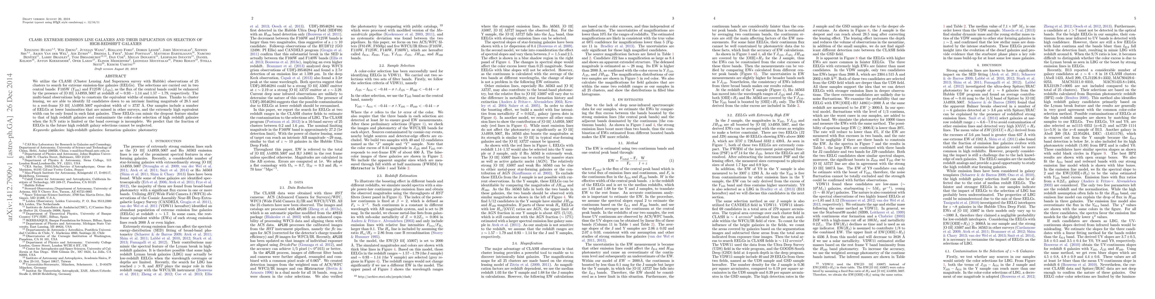 We utilize the CLASH (Cluster Lensing And Supernova survey with Hubble) observations of 25 clusters to search for extreme emission-line galaxies (EELGs). The selections are carried out in two central bands: F105W (Y105) and F125W (J125), as the flux of the central bands could be enhanced by the presence of [O III] 4959, 5007 at redshift of about 0.93-1.14 and 1.57-1.79, respectively. The multi-band observations help to constrain the equivalent widths of emission lines. Thanks to cluster lensing, we are able to identify 52 candidates down to an intrinsic limiting magnitude of 28.5 and to a rest-frame [O III] 4959,5007 equivalent width of about 3737 angstrom. Our samples include a number of EELGs at lower luminosities that are missed in other surveys, and the extremely high equivalent width can be only found in such faint galaxies. These EELGs can mimic the dropout feature similar to that of high redshift galaxies and contaminate the color-color selection of high redshift galaxies when the S/N ratio is limited or the band coverage is incomplete. We predict that the fraction of EELGs in the future high redshift galaxy selections cannot be neglected.