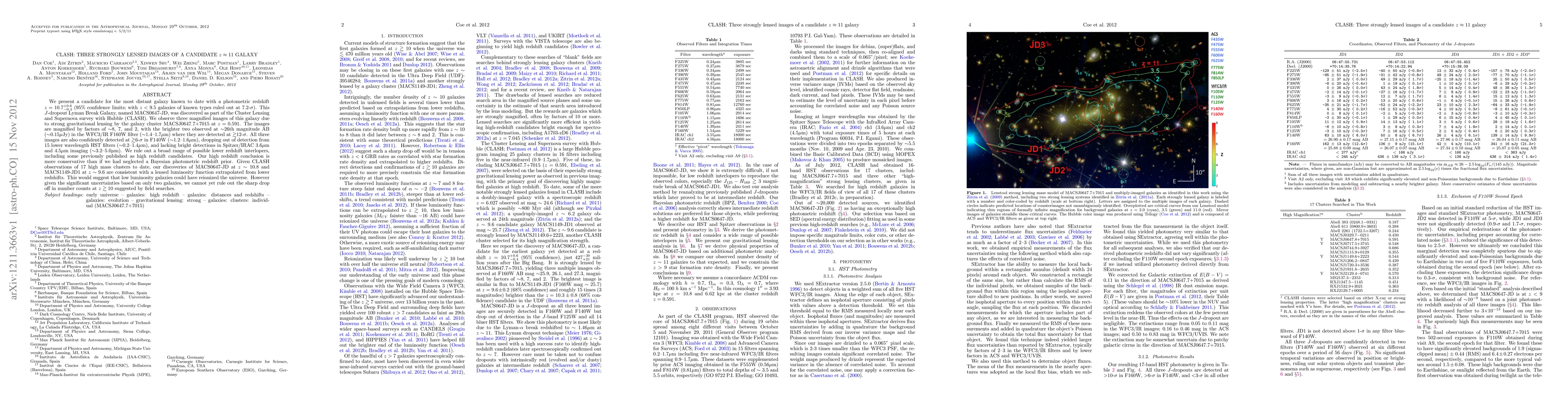 We present a candidate for the most distant galaxy known to date with a photometric redshift z = 10.7 +0.6 / -0.4 (95% confidence limits; with z < 9.5 galaxies of known types ruled out at 7.2-sigma). This J-dropout Lyman Break Galaxy, named MACS0647-JD, was discovered as part of the Cluster Lensing and Supernova survey with Hubble (CLASH). We observe three magnified images of this galaxy due to strong gravitational lensing by the galaxy cluster MACSJ0647.7+7015 at z = 0.591. The images are magnified by factors of ~8, 7, and 2, with the brighter two observed at ~26th magnitude AB (~0.15 uJy) in the WFC3/IR F160W filter (~1.4 - 1.7 um) where they are detected at >~ 12-sigma. All three images are also confidently detected at >~ 6-sigma in F140W (~1.2 - 1.6 um), dropping out of detection from 15 lower wavelength HST filters (~0.2 - 1.4 um), and lacking bright detections in Spitzer/IRAC 3.6um and 4.5um imaging (~3.2 - 5.0 um). We rule out a broad range of possible lower redshift interlopers, including some previously published as high redshift candidates. Our high redshift conclusion is more conservative than if we had neglected a Bayesian photometric redshift prior. Given CLASH observations of 17 high mass clusters to date, our discoveries of MACS0647-JD at z ~ 10.8 and MACS1149-JD1 at z ~ 9.6 are consistent with a lensed luminosity function extrapolated from lower redshifts. This would suggest that low luminosity galaxies could have reionized the universe. However given the significant uncertainties based on only two galaxies, we cannot yet rule out the sharp drop off in number counts at z >~ 10 suggested by field searches.