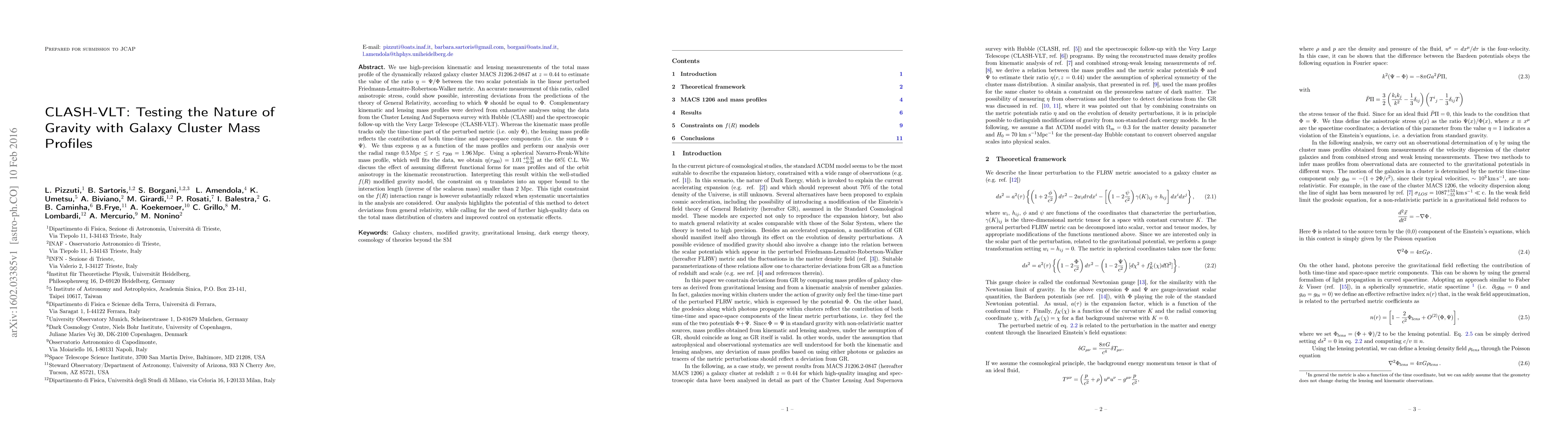 We use high-precision kinematic and lensing measurements of the total mass profile of the dynamically relaxed galaxy cluster MACS J1206.2-0847 at $z=0.44$ to estimate the value of the ratio $\eta=\Psi/\Phi$ between the two scalar potentials in the linear perturbed Friedmann-Lemaitre-Robertson-Walker metric.[...] Complementary kinematic and lensing mass profiles were derived from exhaustive analyses using the data from the Cluster Lensing And Supernova survey with Hubble (CLASH) and the spectroscopic follow-up with the Very Large Telescope (CLASH-VLT). Whereas the kinematic mass profile tracks only the time-time part of the perturbed metric (i.e. only $\Phi$), the lensing mass profile reflects the contribution of both time-time and space-space components (i.e. the sum $\Phi+\Psi$). We thus express $\eta$ as a function of the mass profiles and perform our analysis over the radial range $0.5\,Mpc\le r\le r_{200}=1.96\,Mpc$. Using a spherical Navarro-Frenk-White mass profile, which well fits the data, we obtain $\eta(r_{200})=1.01\,_{-0.28}^{+0.31}$ at the 68\% C.L. We discuss the effect of assuming different functional forms for mass profiles and of the orbit anisotropy in the kinematic reconstruction. Interpreting this result within the well-studied $f(R)$ modified gravity model, the constraint on $\eta$ translates into an upper bound to the interaction length (inverse of the scalaron mass) smaller than 2 Mpc. This tight constraint on the $f(R)$ interaction range is however substantially relaxed when systematic uncertainties in the analysis are considered. Our analysis highlights the potential of this method to detect deviations from general relativity, while calling for the need of further high-quality data on the total mass distribution of clusters and improved control on systematic effects.