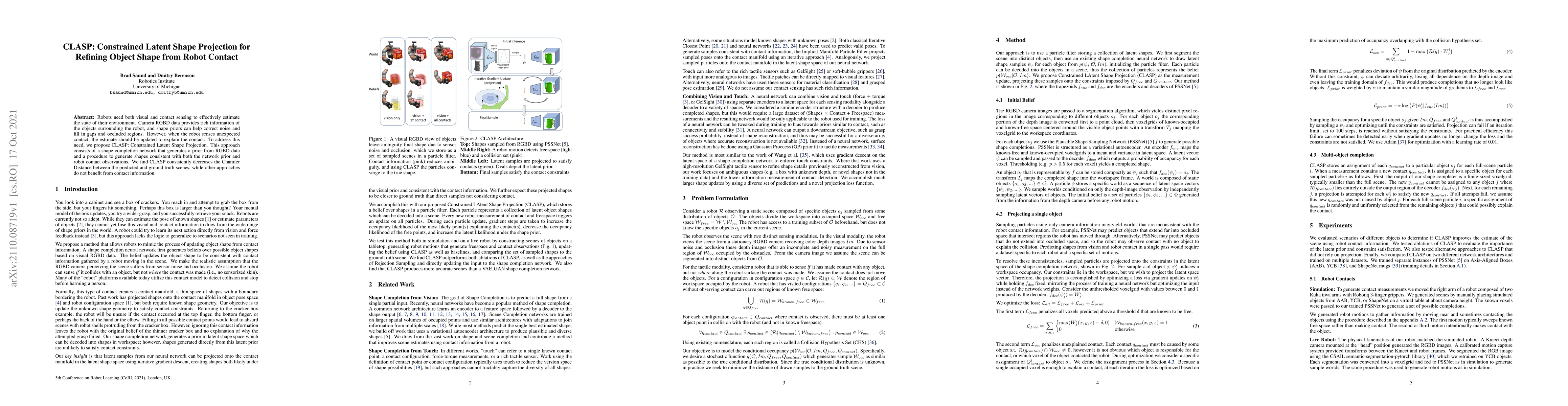 Robots need both visual and contact sensing to effectively estimate the state of their environment. Camera RGBD data provides rich information of the objects surrounding the robot, and shape priors can help correct noise and fill in gaps and occluded regions. However, when the robot senses unexpected contact, the estimate should be updated to explain the contact. To address this need, we propose CLASP: Constrained Latent Shape Projection. This approach consists of a shape completion network that generates a prior from RGBD data and a procedure to generate shapes consistent with both the network prior and robot contact observations. We find CLASP consistently decreases the Chamfer Distance between the predicted and ground truth scenes, while other approaches do not benefit from contact information.