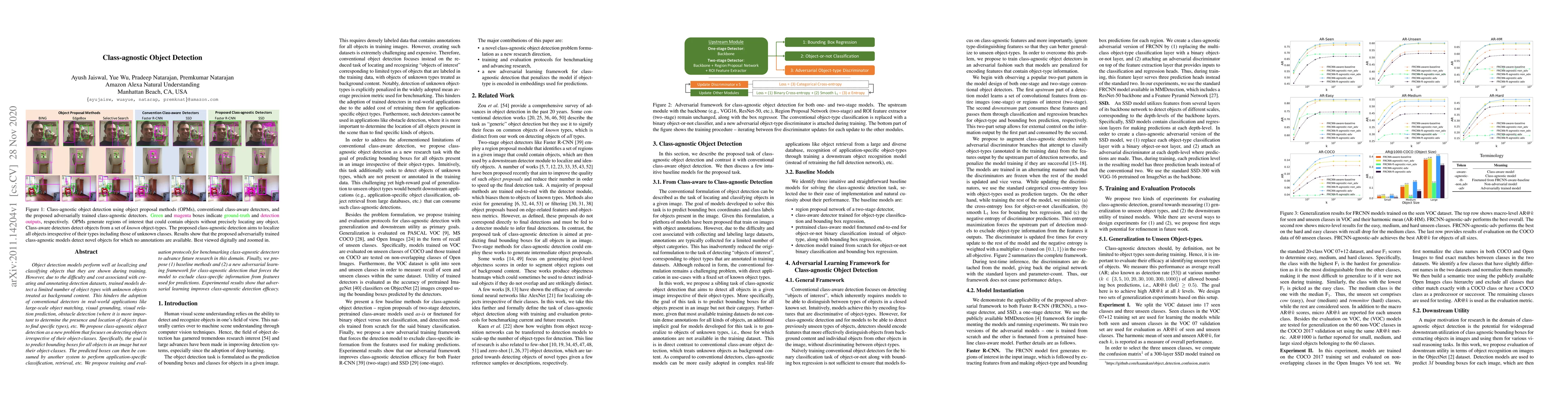 This paper introduces class-agnostic object detection, aiming to identify objects without classifying them, addressing the limitations of conventional detectors in real-world applications. It proposes training and evaluation protocols, baseline methods, and an adversarial learning framework to enhance detection efficacy.