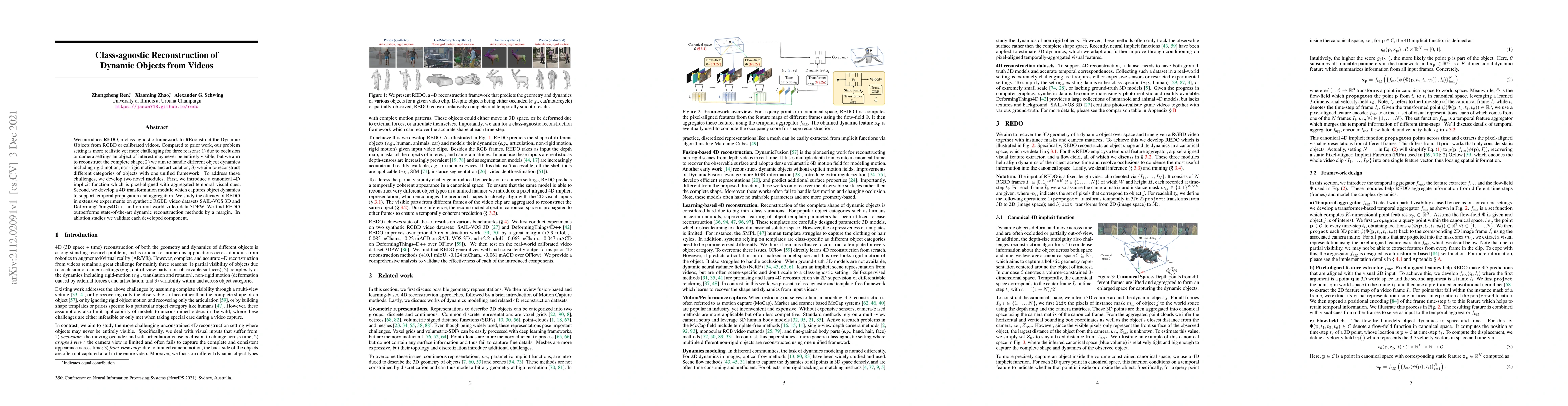 We introduce REDO, a class-agnostic framework to REconstruct the Dynamic Objects from RGBD or calibrated videos. Compared to prior work, our problem setting is more realistic yet more challenging for three reasons: 1) due to occlusion or camera settings an object of interest may never be entirely visible, but we aim to reconstruct the complete shape; 2) we aim to handle different object dynamics including rigid motion, non-rigid motion, and articulation; 3) we aim to reconstruct different categories of objects with one unified framework. To address these challenges, we develop two novel modules. First, we introduce a canonical 4D implicit function which is pixel-aligned with aggregated temporal visual cues. Second, we develop a 4D transformation module which captures object dynamics to support temporal propagation and aggregation. We study the efficacy of REDO in extensive experiments on synthetic RGBD video datasets SAIL-VOS 3D and DeformingThings4D++, and on real-world video data 3DPW. We find REDO outperforms state-of-the-art dynamic reconstruction methods by a margin. In ablation studies we validate each developed component.