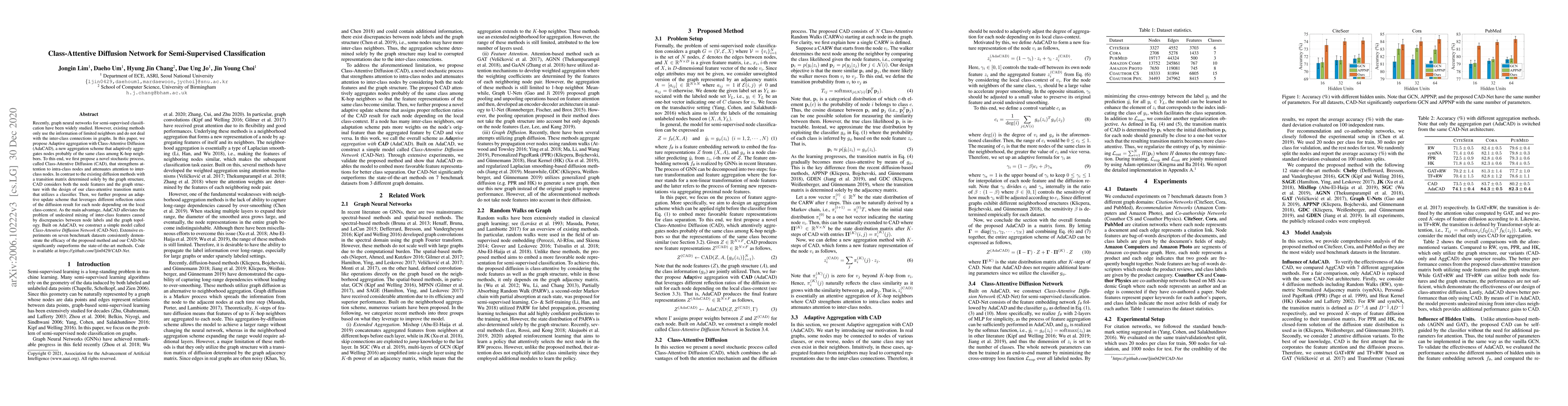 Recently, graph neural networks for semi-supervised classification have been widely studied. However, existing methods only use the information of limited neighbors and do not deal with the inter-class connections in graphs. In this paper, we propose Adaptive aggregation with Class-Attentive Diffusion (AdaCAD), a new aggregation scheme that adaptively aggregates nodes probably of the same class among K-hop neighbors. To this end, we first propose a novel stochastic process, called Class-Attentive Diffusion (CAD), that strengthens attention to intra-class nodes and attenuates attention to inter-class nodes. In contrast to the existing diffusion methods with a transition matrix determined solely by the graph structure, CAD considers both the node features and the graph structure with the design of our class-attentive transition matrix that utilizes a classifier. Then, we further propose an adaptive update scheme that leverages different reflection ratios of the diffusion result for each node depending on the local class-context. As the main advantage, AdaCAD alleviates the problem of undesired mixing of inter-class features caused by discrepancies between node labels and the graph topology. Built on AdaCAD, we construct a simple model called Class-Attentive Diffusion Network (CAD-Net). Extensive experiments on seven benchmark datasets consistently demonstrate the efficacy of the proposed method and our CAD-Net significantly outperforms the state-of-the-art methods. Code is available at https://github.com/ljin0429/CAD-Net.