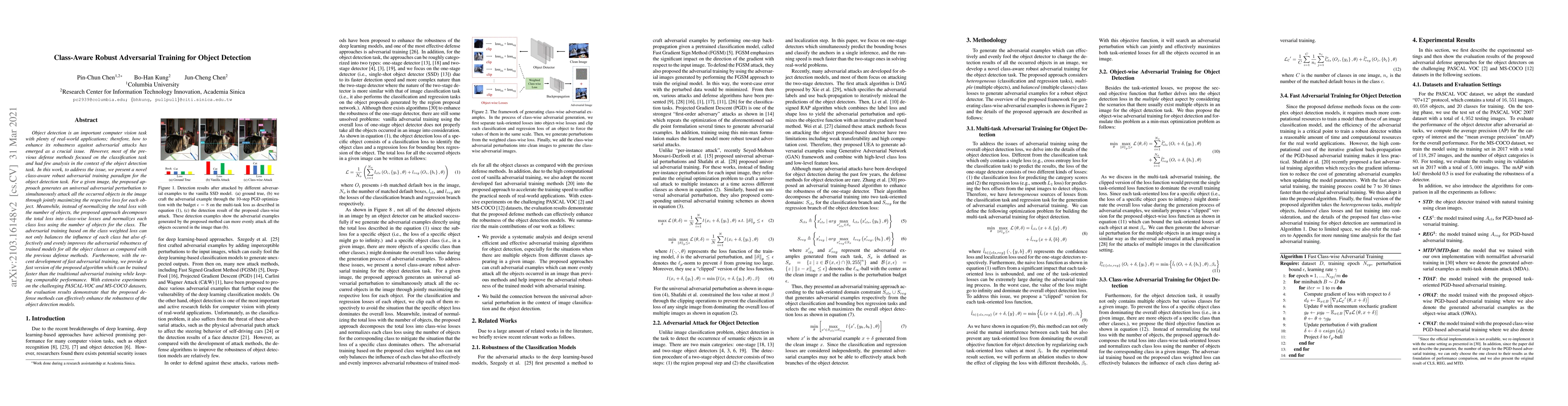 This paper introduces a novel class-aware robust adversarial training method for object detection, generating universal adversarial perturbations that attack all objects in an image while balancing class-specific losses. The approach enhances model robustness across all classes and provides a faster training variant, demonstrated to be effective on PASCAL-VOC and MS-COCO datasets.