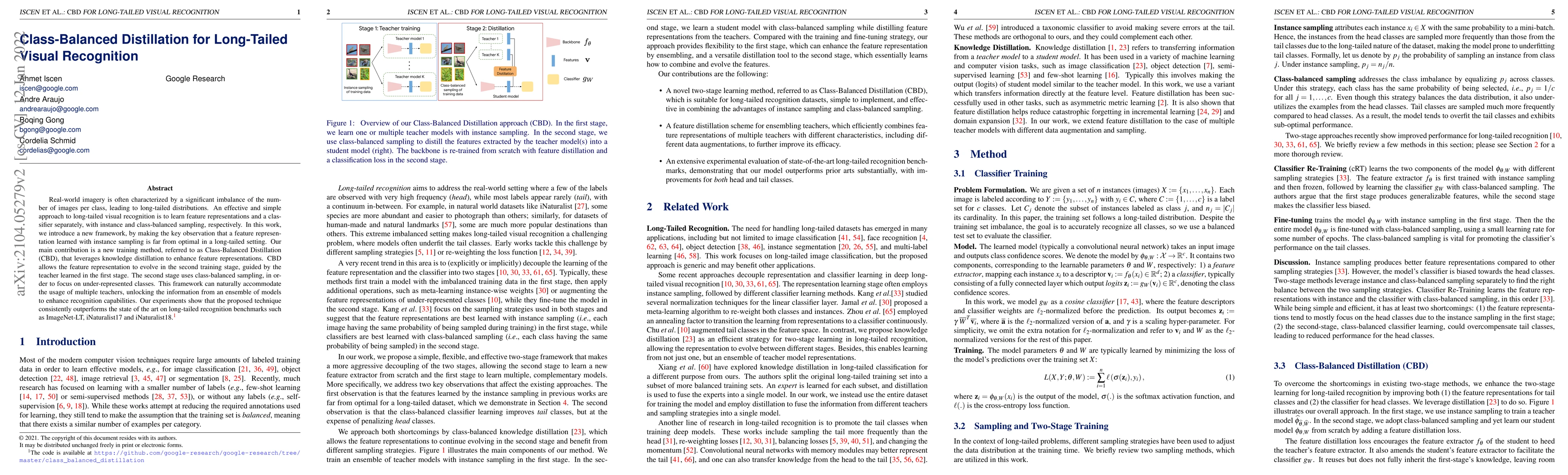 This paper proposes Class-Balanced Distillation (CBD), a novel training method for long-tailed visual recognition that leverages knowledge distillation to improve feature representations. CBD enhances the feature extractor through a second training stage guided by a teacher model, using class-balanced sampling to focus on under-represented classes, and outperforms state-of-the-art methods on benchmarks like ImageNet-LT and iNaturalist.