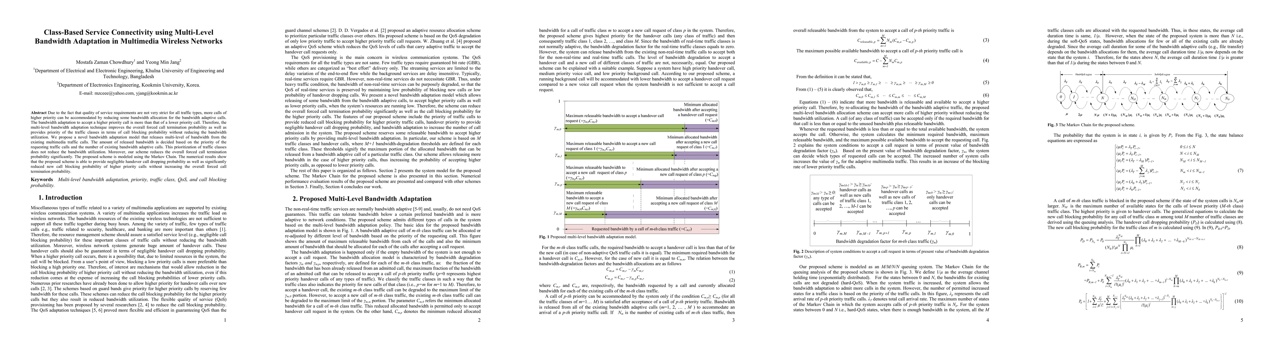 This paper proposes a multi-level bandwidth adaptation model to prioritize higher-priority traffic calls in multimedia wireless networks by reducing bandwidth for lower-priority adaptive calls. The model uses Markov Chain modeling, achieving lower call dropping and blocking probabilities for higher-priority calls without reducing overall bandwidth utilization.