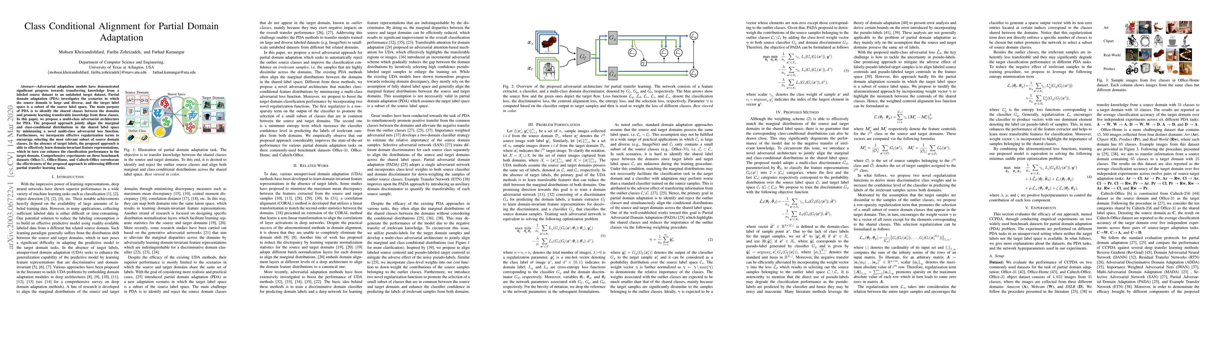Adversarial adaptation models have demonstrated significant progress towards transferring knowledge from a labeled source dataset to an unlabeled target dataset. Partial domain adaptation (PDA) investigates the scenarios in which the source domain is large and diverse, and the target label space is a subset of the source label space. The main purpose of PDA is to identify the shared classes between the domains and promote learning transferable knowledge from these classes. In this paper, we propose a multi-class adversarial architecture for PDA. The proposed approach jointly aligns the marginal and class-conditional distributions in the shared label space by minimaxing a novel multi-class adversarial loss function. Furthermore, we incorporate effective regularization terms to encourage selecting the most relevant subset of source domain classes. In the absence of target labels, the proposed approach is able to effectively learn domain-invariant feature representations, which in turn can enhance the classification performance in the target domain. Comprehensive experiments on three benchmark datasets Office-31, Office-Home, and Caltech-Office corroborate the effectiveness of the proposed approach in addressing different partial transfer learning tasks.
