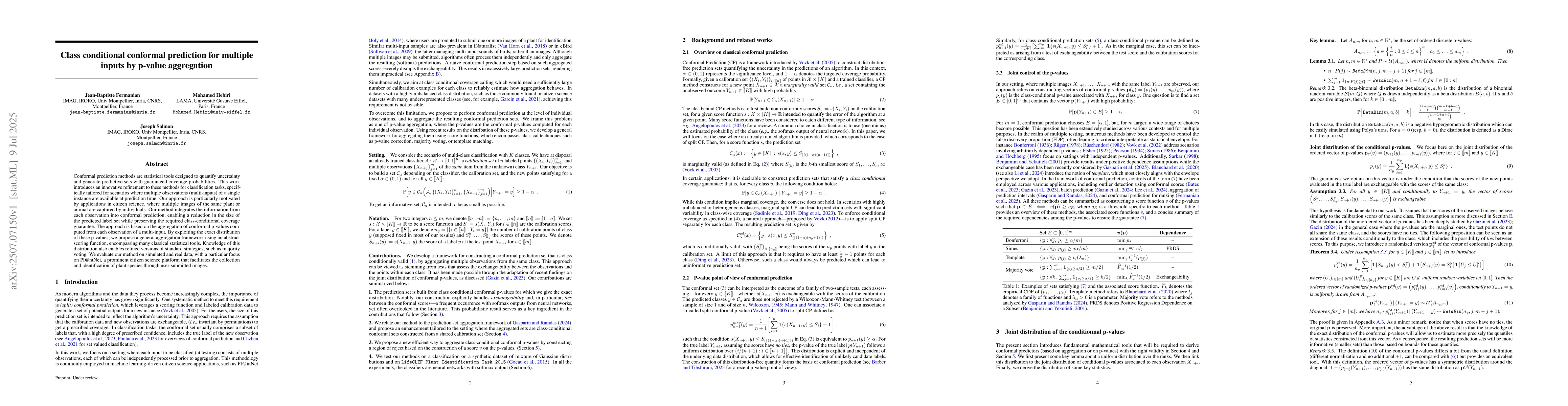 This research introduces a refined conformal prediction method for classification tasks with multiple inputs, like images in citizen science. It aggregates conformal p-values from each observation, reducing predicted label set size while maintaining coverage guarantees, and is evaluated on simulated and real data, including the Pl@ntNet platform.