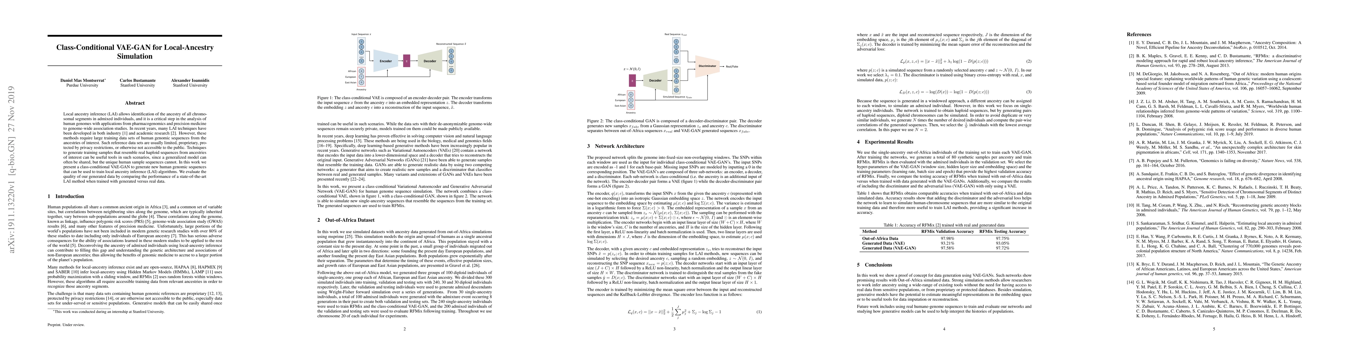 This paper introduces a class-conditional VAE-GAN to simulate local ancestry in human genomes, addressing the scarcity of accessible training data for local ancestry inference methods. The generated sequences are evaluated for their utility in training LAI algorithms by comparing their impact on the performance of a state-of-the-art LAI method.
