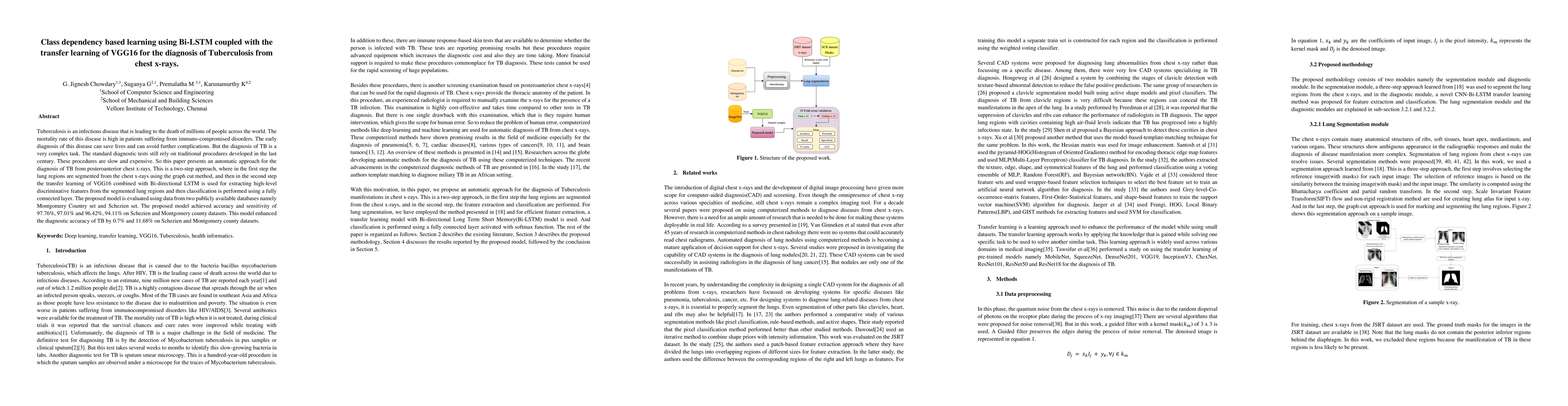 Tuberculosis is an infectious disease that is leading to the death of millions of people across the world. The mortality rate of this disease is high in patients suffering from immuno-compromised disorders. The early diagnosis of this disease can save lives and can avoid further complications. But the diagnosis of TB is a very complex task. The standard diagnostic tests still rely on traditional procedures developed in the last century. These procedures are slow and expensive. So this paper presents an automatic approach for the diagnosis of TB from posteroanterior chest x-rays. This is a two-step approach, where in the first step the lung regions are segmented from the chest x-rays using the graph cut method, and then in the second step the transfer learning of VGG16 combined with Bi-directional LSTM is used for extracting high-level discriminative features from the segmented lung regions and then classification is performed using a fully connected layer. The proposed model is evaluated using data from two publicly available databases namely Montgomery Country set and Schezien set. The proposed model achieved accuracy and sensitivity of 97.76%, 97.01% and 96.42%, 94.11% on Schezien and Montgomery county datasets. This model enhanced the diagnostic accuracy of TB by 0.7% and 11.68% on Schezien and Montgomery county datasets.