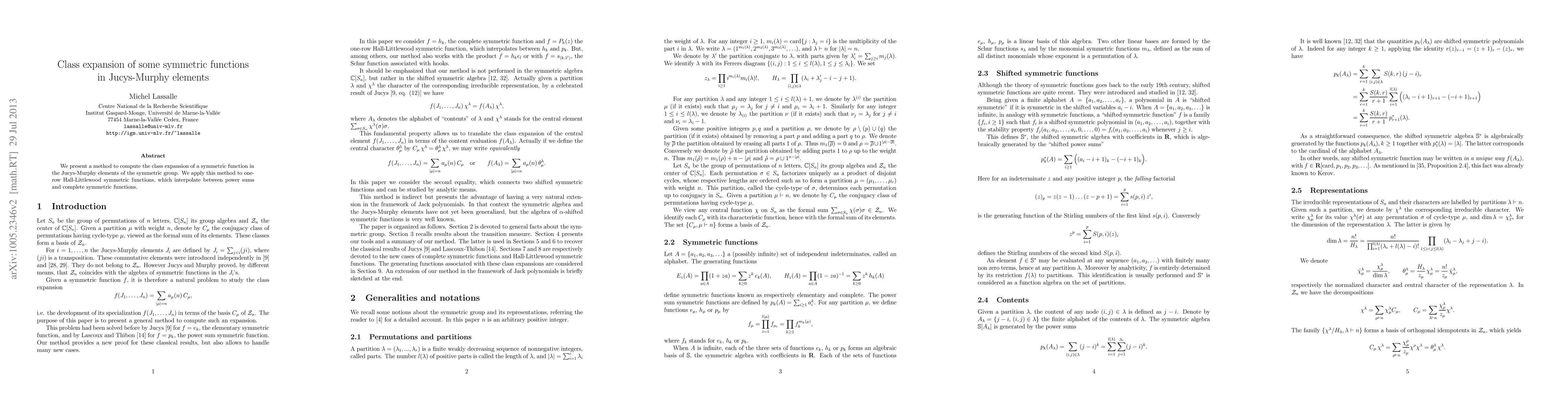 We present a method to compute the class expansion of a symmetric function in the Jucys-Murphy elements of the symmetric group. We apply this method to one-row Hall-Littlewood symmetric functions, which interpolate between power sums and complete symmetric functions.