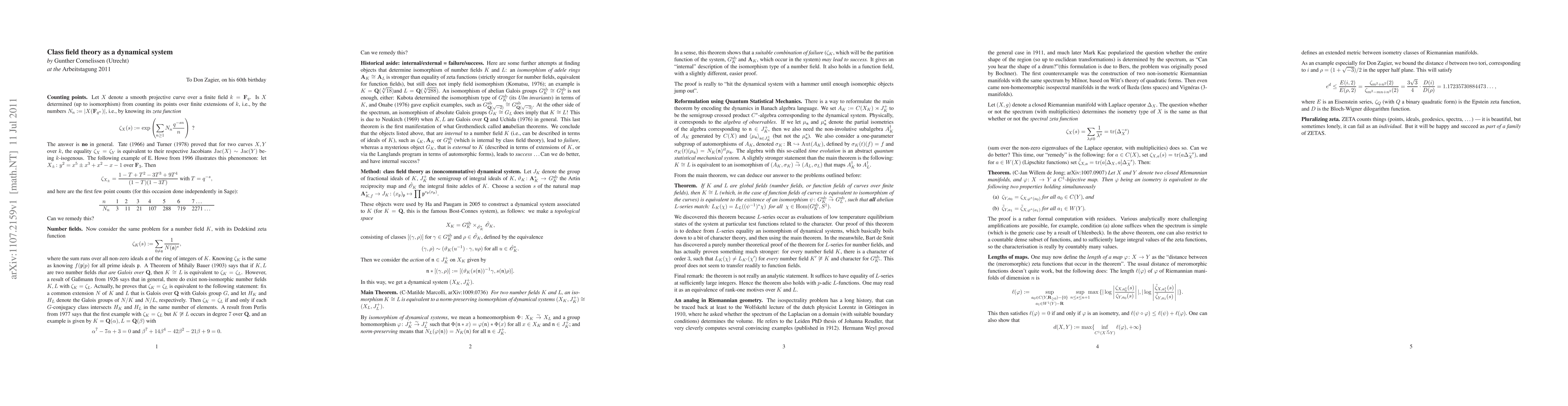 This is the text from a talk at the Arbeitstagung 2011, which can serve as an introduction to arxiv:1009.0736 and arXiv:1007.0907. I first discuss how a global field is determined by a certain dynamical system, and how this relates to abelian L-series determining those fields. I then discuss an analog in Riemannian geometry, and how it leads to a metric in the space of closed Riemannian manifolds.