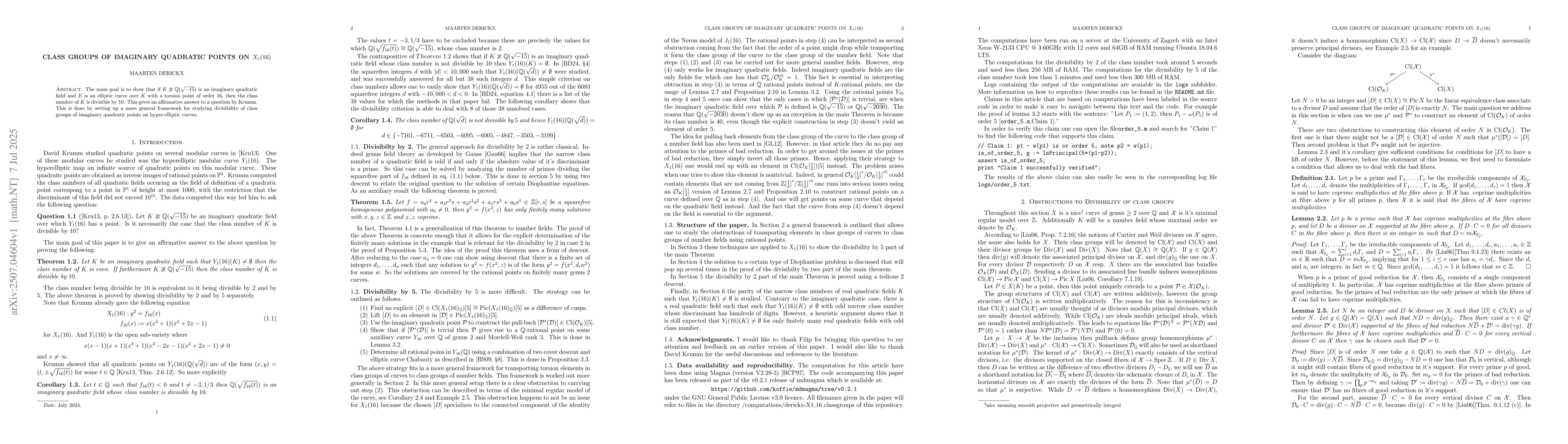 The main result is to show that if $K \ncong \mathbb Q(\sqrt{-15})$ is an imaginary quadratic field and $E$ is an elliptic curve over $K$ with a torsion point of order 16, then the class number of $K$ is divisible by 10. This gives an affirmative answer to a 12 year old question by David Krumm. This is done by setting up a more general framework for studying divisibility of class groups of imaginary quadratic points on hyper-elliptic curves and applying it to $X_1(16)$.