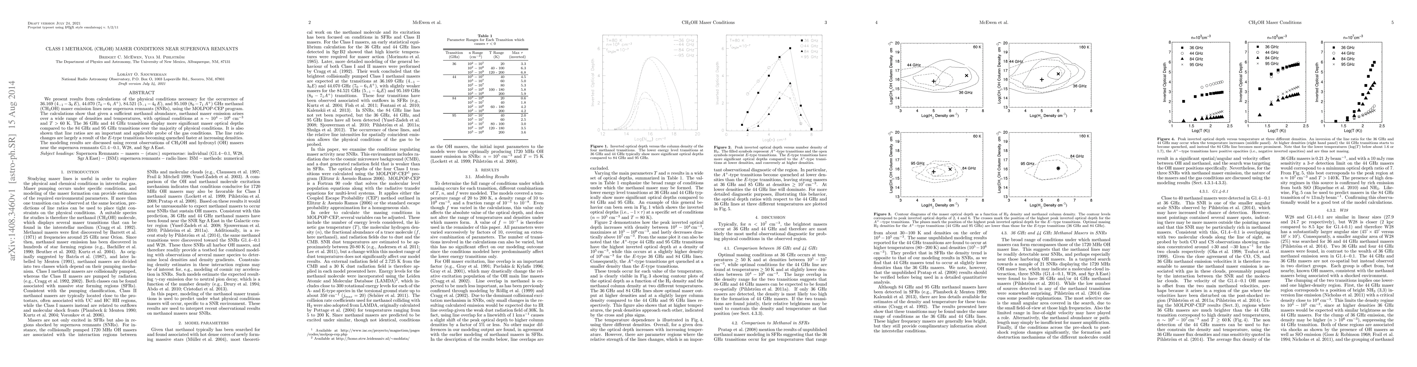 Researchers found that under sufficient methanol abundance, maser emission can occur over a wide range of densities and temperatures near supernova remnants, with optimal conditions at $10^4-10^6$ cm$^{-3}$ and $T>60$ K.
