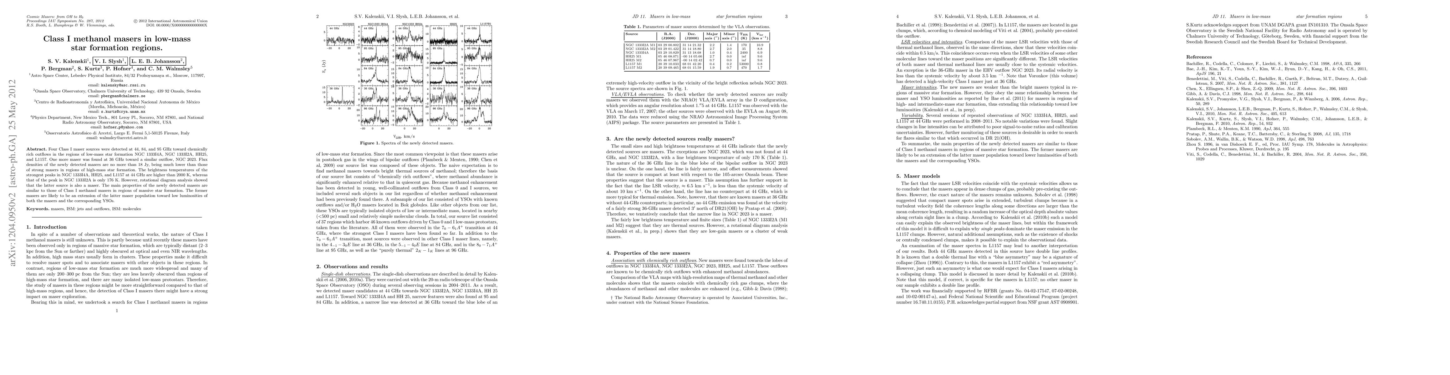 This paper reports the detection of four Class I methanol maser sources in low-mass star formation regions, with flux densities significantly lower than those in high-mass star formation regions. The study suggests these masers are an extension of the maser population found in massive star formation regions, characterized by lower luminosity.
