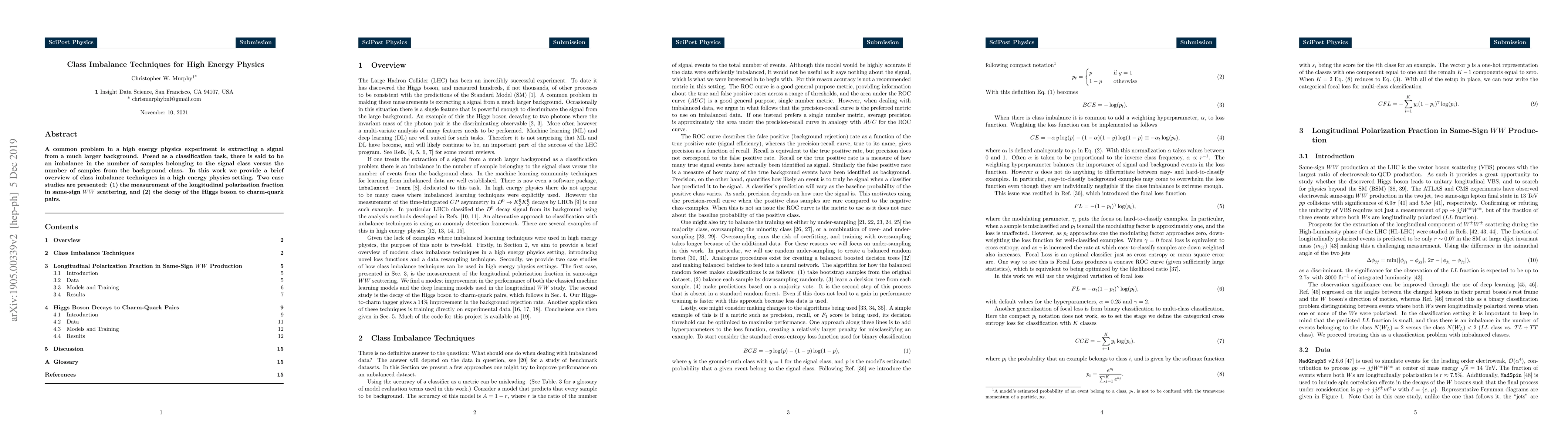 A common problem in a high energy physics experiment is extracting a signal from a much larger background. Posed as a classification task, there is said to be an imbalance in the number of samples belonging to the signal class versus the number of samples from the background class. In this work we provide a brief overview of class imbalance techniques in a high energy physics setting. Two case studies are presented: (1) the measurement of the longitudinal polarization fraction in same-sign $WW$ scattering, and (2) the decay of the Higgs boson to charm-quark pairs.