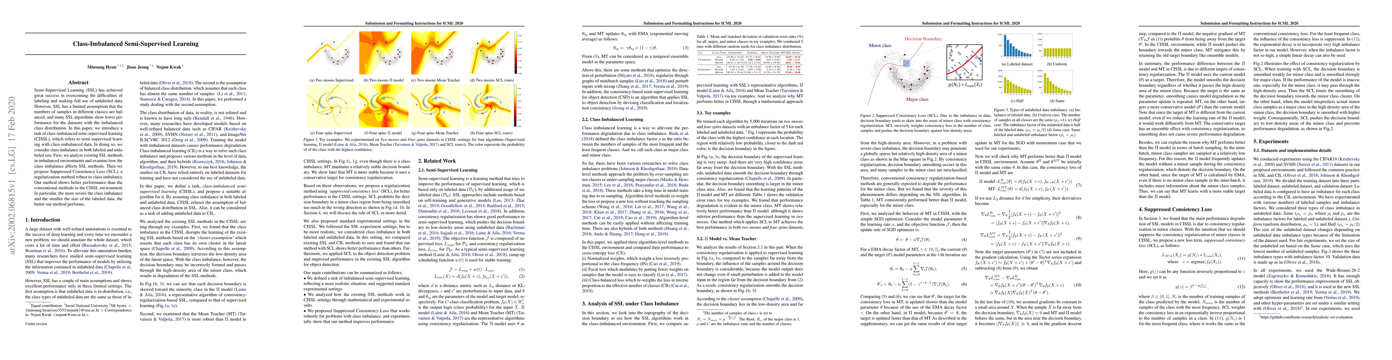 This paper addresses class-imbalanced semi-supervised learning (CISSL), proposing a Suppressed Consistency Loss (SCL) method to improve performance in imbalanced datasets. The SCL method demonstrates superior results, especially under severe class imbalance and limited labeled data.