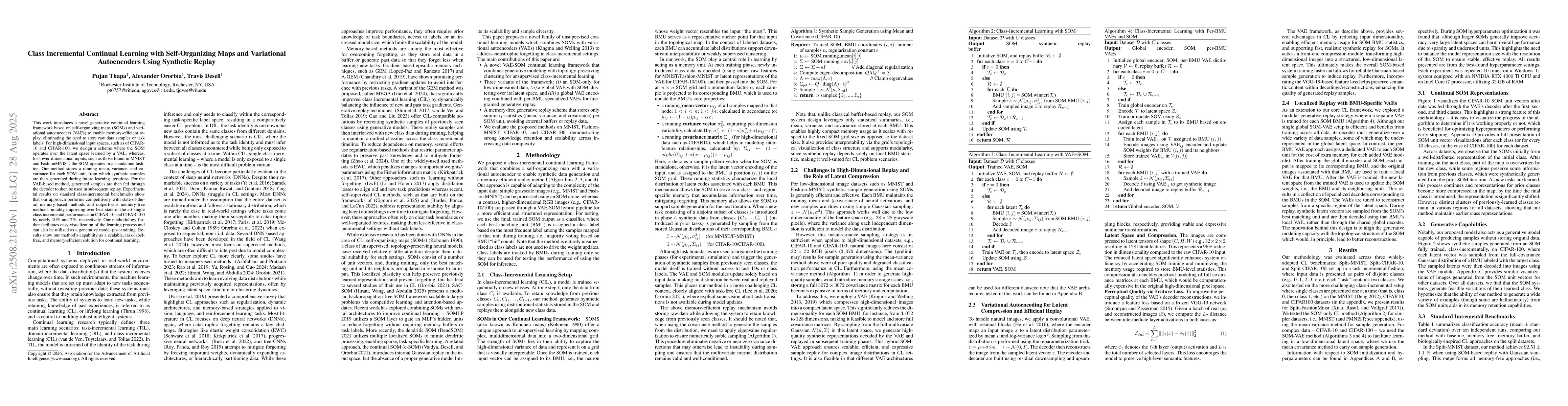 This work introduces a novel generative continual learning framework based on self-organizing maps (SOMs) and variational autoencoders (VAEs) to enable memory-efficient replay, eliminating the need to store raw data samples or task labels. For high-dimensional input spaces, such as of CIFAR-10 and CIFAR-100, we design a scheme where the SOM operates over the latent space learned by a VAE, whereas, for lower-dimensional inputs, such as those found in MNIST and FashionMNIST, the SOM operates in a standalone fashion. Our method stores a running mean, variance, and covariance for each SOM unit, from which synthetic samples are then generated during future learning iterations. For the VAE-based method, generated samples are then fed through the decoder to then be used in subsequent replay. Experimental results on standard class-incremental benchmarks show that our approach performs competitively with state-of-the-art memory-based methods and outperforms memory-free methods, notably improving over best state-of-the-art single class incremental performance on CIFAR-10 and CIFAR-100 by nearly $10$\% and $7$\%, respectively. Our methodology further facilitates easy visualization of the learning process and can also be utilized as a generative model post-training. Results show our method's capability as a scalable, task-label-free, and memory-efficient solution for continual learning.