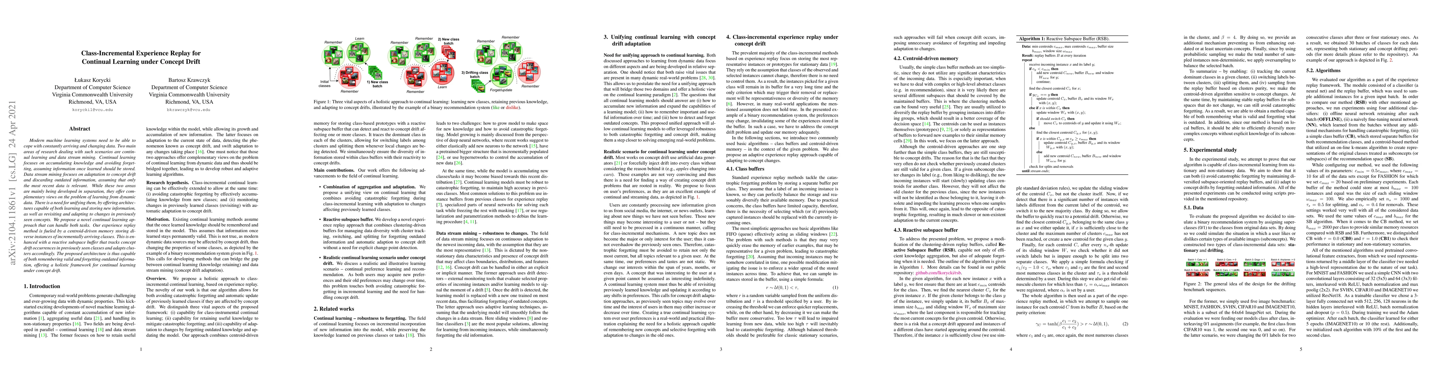 This paper proposes a novel continual learning approach that integrates experience replay with a reactive subspace buffer to manage both learning and forgetting in the context of concept drift. The method employs a centroid-driven memory to store diverse instances of new classes and adapts clusters to track and respond to changes in previously seen concepts.