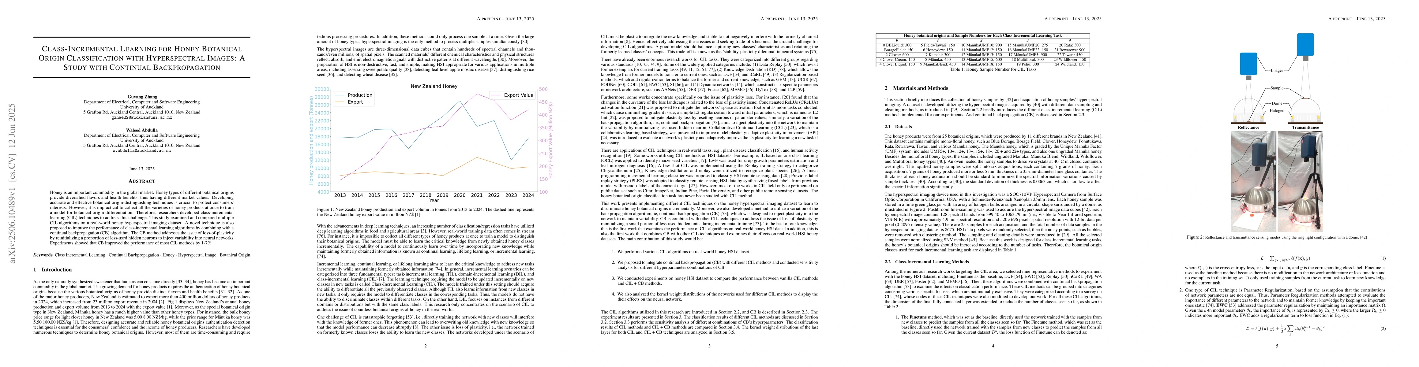 This study explores class-incremental learning (CIL) for identifying honey's botanical origin using hyperspectral images, a practical solution given the vast honey variety. A new technique combining CIL with continual backpropagation (CB) is proposed, enhancing CIL performance by 1-7%. CB addresses loss-of-plasticity in neural networks by reinitializing less-used neurons, injecting variability.