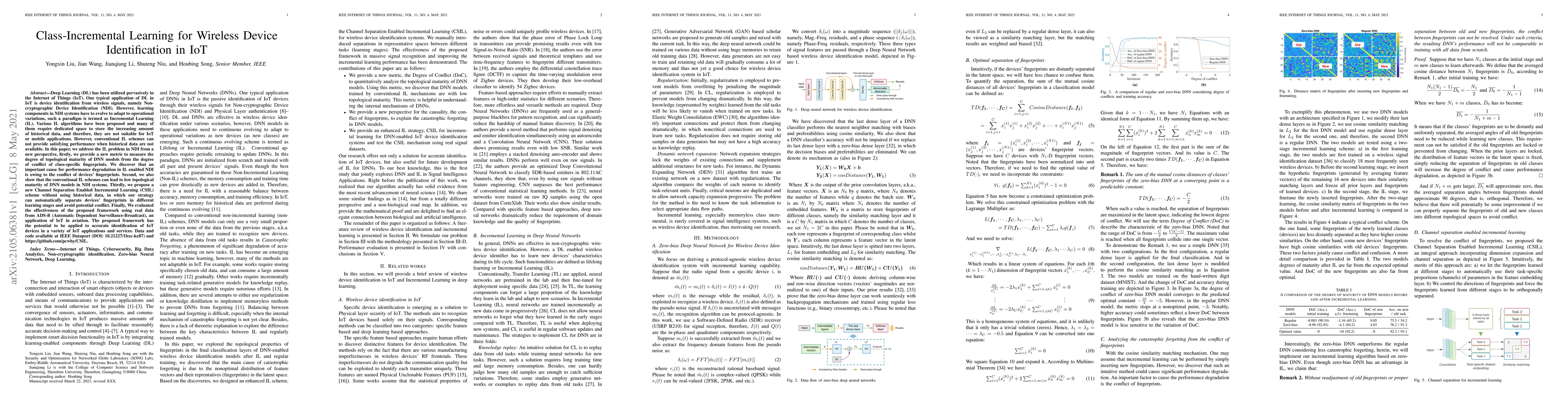 Deep Learning (DL) has been utilized pervasively in the Internet of Things (IoT). One typical application of DL in IoT is device identification from wireless signals, namely Non-cryptographic Device Identification (NDI). However, learning components in NDI systems have to evolve to adapt to operational variations, such a paradigm is termed as Incremental Learning (IL). Various IL algorithms have been proposed and many of them require dedicated space to store the increasing amount of historical data, and therefore, they are not suitable for IoT or mobile applications. However, conventional IL schemes can not provide satisfying performance when historical data are not available. In this paper, we address the IL problem in NDI from a new perspective, firstly, we provide a new metric to measure the degree of topological maturity of DNN models from the degree of conflict of class-specific fingerprints. We discover that an important cause for performance degradation in IL enabled NDI is owing to the conflict of devices' fingerprints. Second, we also show that the conventional IL schemes can lead to low topological maturity of DNN models in NDI systems. Thirdly, we propose a new Channel Separation Enabled Incremental Learning (CSIL) scheme without using historical data, in which our strategy can automatically separate devices' fingerprints in different learning stages and avoid potential conflict. Finally, We evaluated the effectiveness of the proposed framework using real data from ADS-B (Automatic Dependent Surveillance-Broadcast), an application of IoT in aviation. The proposed framework has the potential to be applied to accurate identification of IoT devices in a variety of IoT applications and services. Data and code available at IEEE Dataport (DOI: 10.21227/1bxc-ke87) and \url{https://github.com/pcwhy/CSIL}}