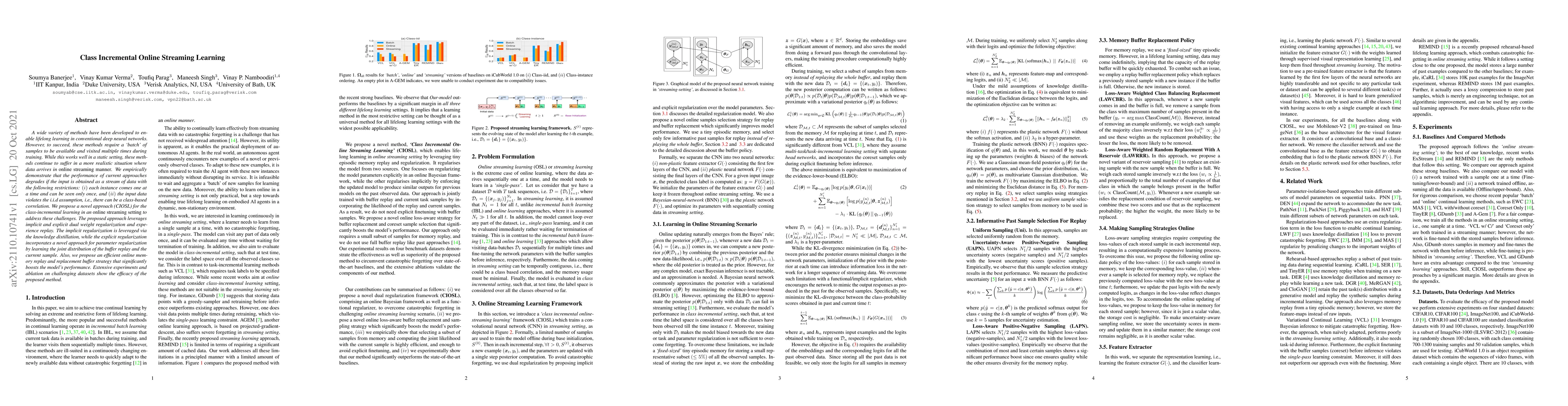 This paper introduces a novel approach (CIOSL) for class-incremental learning in online streaming settings, addressing the challenges of non-i.i.d data and single instance presentations. The method combines dual weight regularization, knowledge distillation, and an efficient online memory replay strategy to maintain performance.