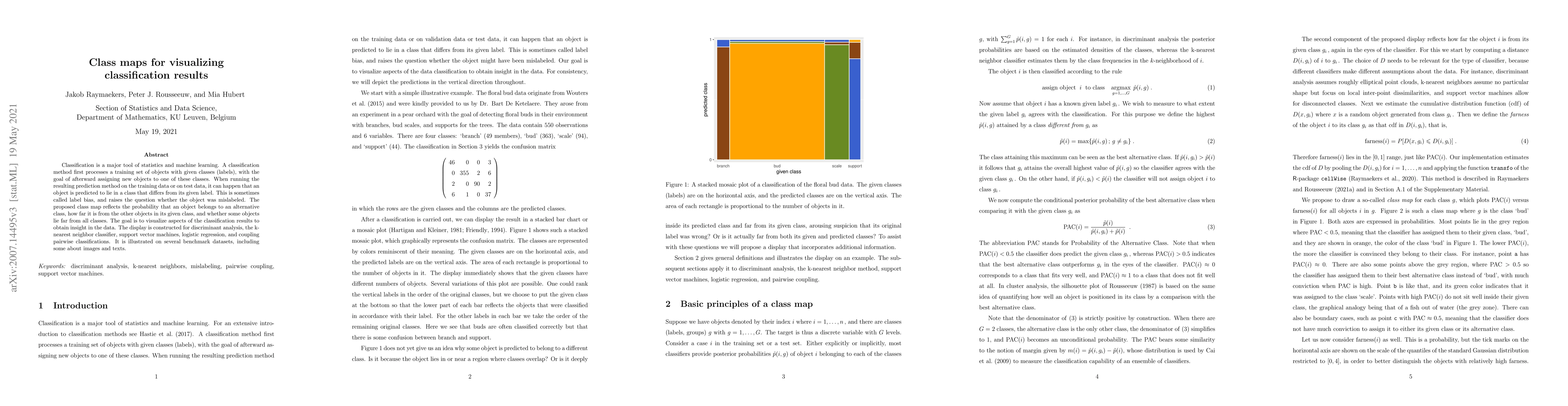 Classification is a major tool of statistics and machine learning. A classification method first processes a training set of objects with given classes (labels), with the goal of afterward assigning new objects to one of these classes. When running the resulting prediction method on the training data or on test data, it can happen that an object is predicted to lie in a class that differs from its given label. This is sometimes called label bias, and raises the question whether the object was mislabeled. The proposed class map reflects the probability that an object belongs to an alternative class, how far it is from the other objects in its given class, and whether some objects lie far from all classes. The goal is to visualize aspects of the classification results to obtain insight in the data. The display is constructed for discriminant analysis, the k-nearest neighbor classifier, support vector machines, logistic regression, and coupling pairwise classifications. It is illustrated on several benchmark datasets, including some about images and texts.