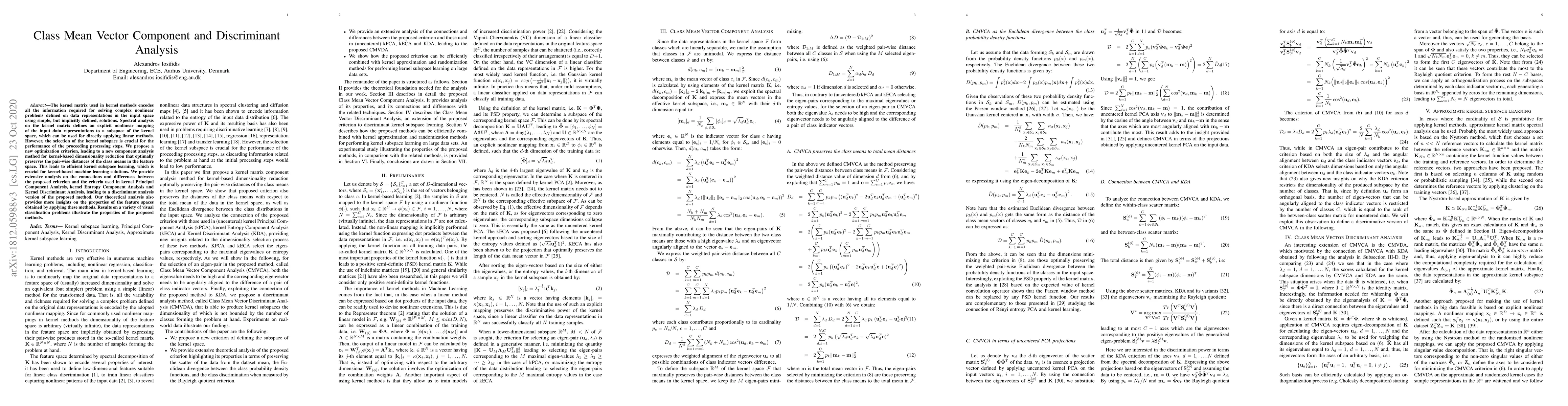 The kernel matrix used in kernel methods encodes all the information required for solving complex nonlinear problems defined on data representations in the input space using simple, but implicitly defined, solutions. Spectral analysis on the kernel matrix defines an explicit nonlinear mapping of the input data representations to a subspace of the kernel space, which can be used for directly applying linear methods. However, the selection of the kernel subspace is crucial for the performance of the proceeding processing steps. In this paper, we propose a component analysis method for kernel-based dimensionality reduction that optimally preserves the pair-wise distances of the class means in the feature space. We provide extensive analysis on the connection of the proposed criterion to those used in kernel principal component analysis and kernel discriminant analysis, leading to a discriminant analysis version of the proposed method. Our analysis also provides more insights on the properties of the feature spaces obtained by applying these methods.
