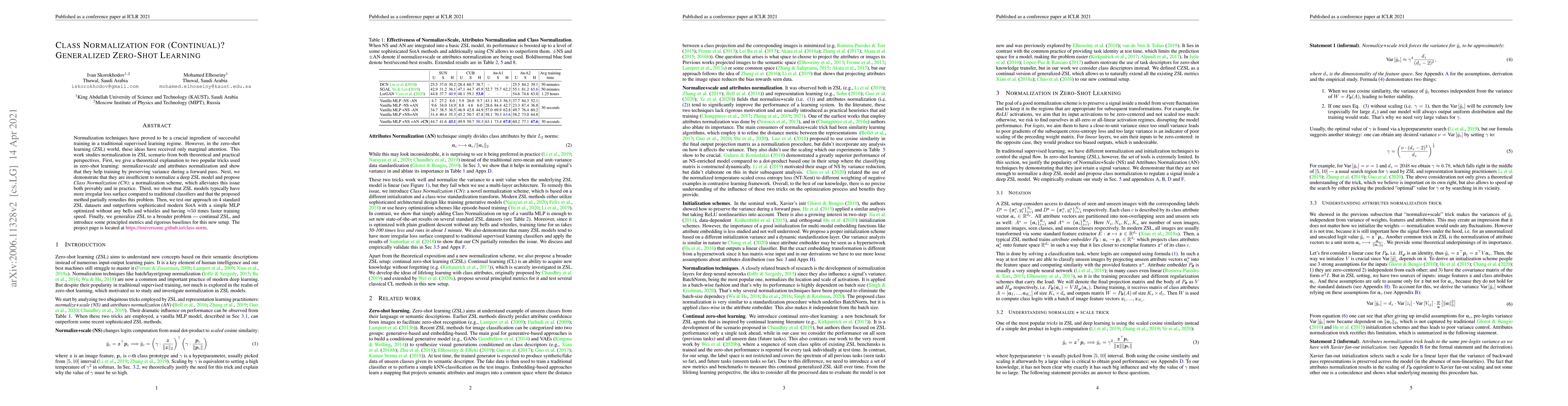 This paper proposes Class Normalization (CN) to address issues in zero-shot learning (ZSL) by theoretically explaining and enhancing normalization techniques. It demonstrates that CN improves model performance and training speed on standard ZSL datasets, and extends the concept to continual ZSL with new metrics and baselines.