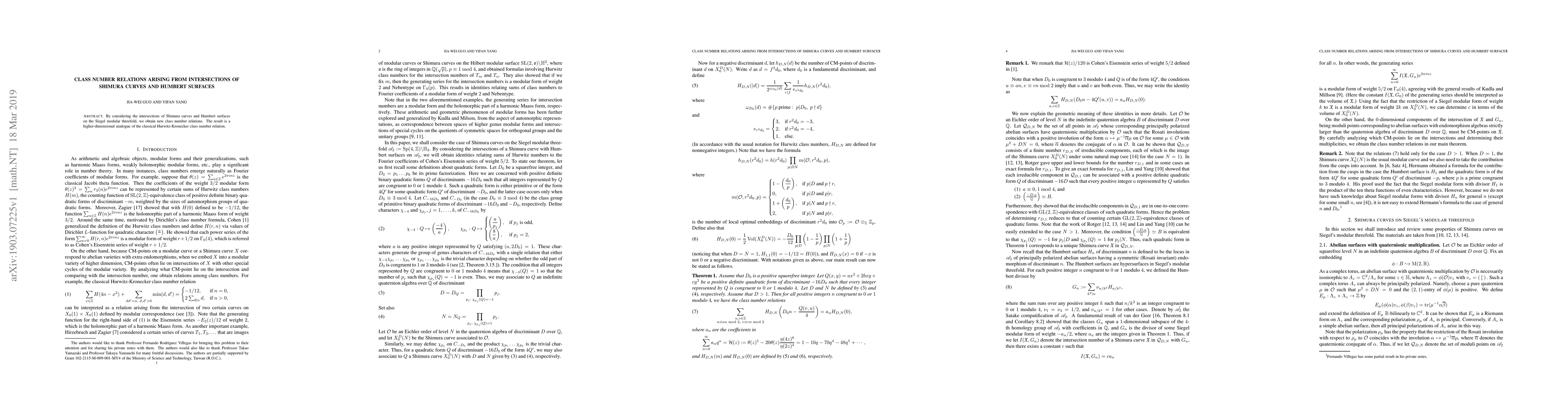 **Summary:** This paper explores intersections of Shimura curves and Humbert surfaces within the Siegel modular threefold, deriving new class number relations. The findings establish a higher-dimensional analogue to the classical Hurwitz-Kronecker class number relation.