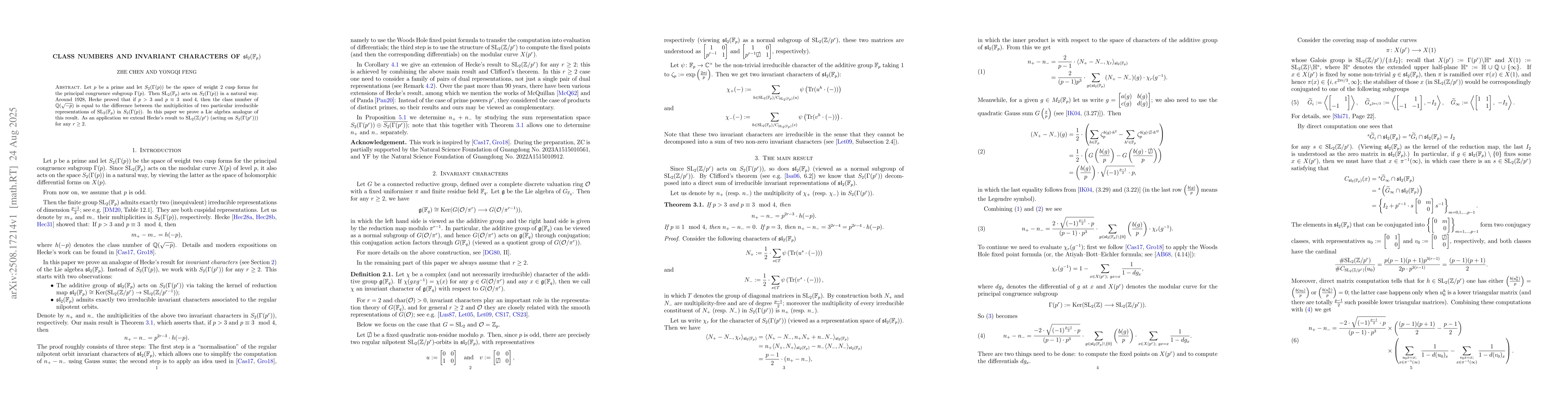 Let $p$ be a prime and let $S_2(\Gamma(p))$ be the space of weight $2$ cusp forms for the principal congruence subgroup $\Gamma(p)$. Then $\mathrm{SL}_2(\mathbb{F}_p)$ acts on $S_2(\Gamma(p))$ in a natural way. Around 1928, Hecke proved that if $p>3$ and $p\equiv 3\mod 4$, then the class number of $\mathbb{Q}(\sqrt{-p})$ is equal to the difference between the multiplicities of two particular irreducible representations of $\mathrm{SL}_2(\mathbb{F}_p)$ in $S_2(\Gamma(p))$. In this paper we prove a Lie algebra analogue of this result. As an application we extend Hecke's result to $\mathrm{SL}_2(\mathbb{Z}/p^r)$ (acting on $S_2(\Gamma(p^r))$) for any $r\geq 2$.