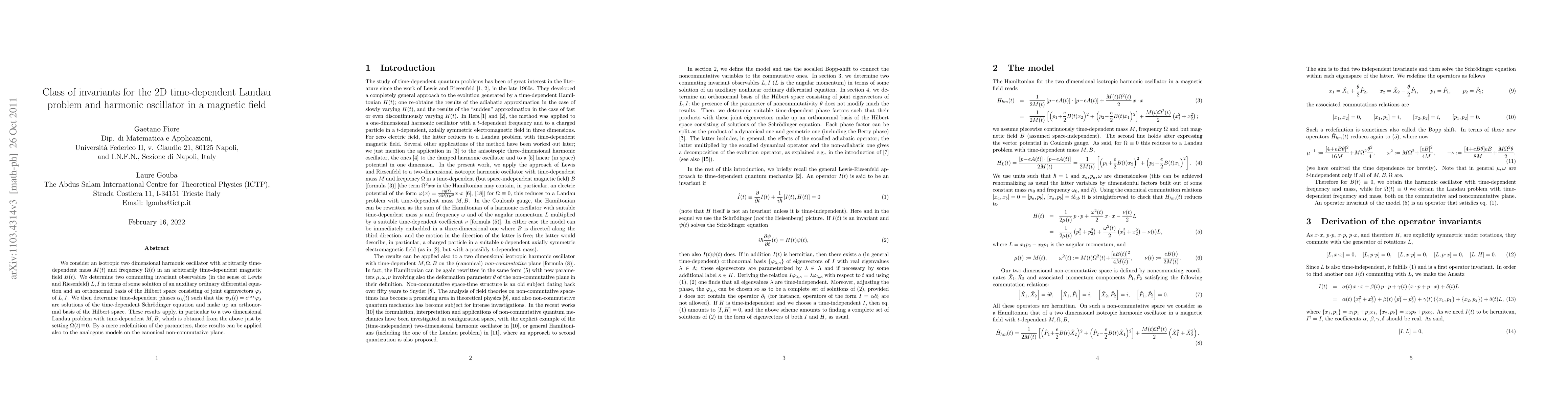 This paper identifies two commuting invariant observables for a 2D harmonic oscillator with time-dependent parameters in a magnetic field, providing a solution to the time-dependent Schrödinger equation. The results are applicable to both the Landau problem and analogous models on the non-commutative plane.