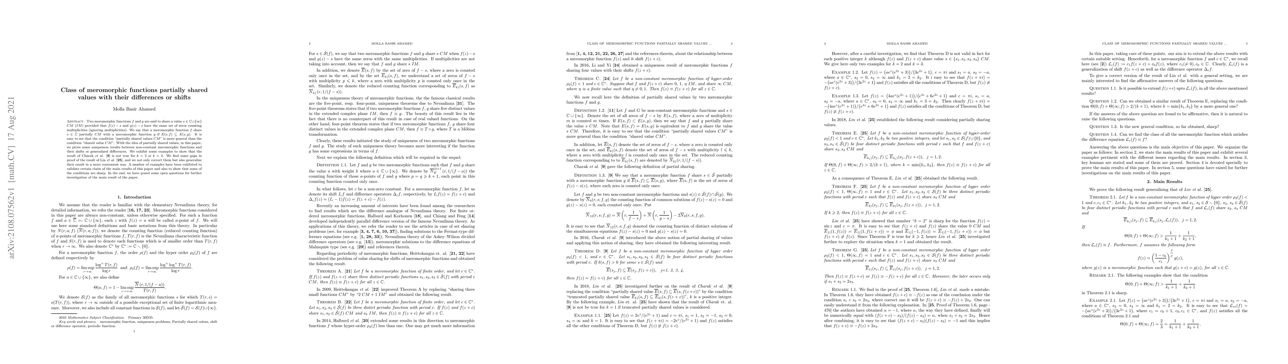 Two meromorphic functions $ f $ and $ g $ are said to share a value $ s\in\mathbb{C}\cup\{\infty\} $ $ CM $ $ (IM) $ provided that $ f(z)-s $ and $ g(z)-s $ have the same set of zeros counting multiplicities (ignoring multiplicities). We say that a meromorphic function $ f $ share $ s\in\mathbb{C} $ partially $ CM $ with a meromorphic function $ g $ if $ E(s,f)\subseteq E(s,g)$. It is easy to see that the condition ``partially shared values $ CM $" is more general than the condition ``shared value $ CM $". With the idea of partially shared values, in this paper, we prove some uniqueness results between non-constant meromorphic functions and their shifts or generalized differences. We exhibit some examples to show that the result of {Charak \emph{et al.}} \cite{Cha & Kor & Kum-2016} is not true for $k=2 $ or $ k=3 $. We find some gaps in proof of the result of {Lin} \emph{et al.} \cite{Lin & Lin & Wu}, and we not only correct them but also generalize their result in a more convenient way. A number of examples have been exhibited to validate a certain claim of the main results of this paper and also to show that some of the conditions are sharp. In the end, we have posed some open questions for further investigation of the main result of the paper.
